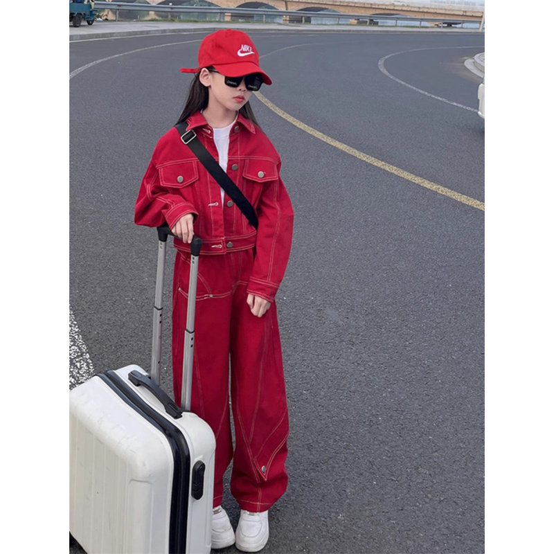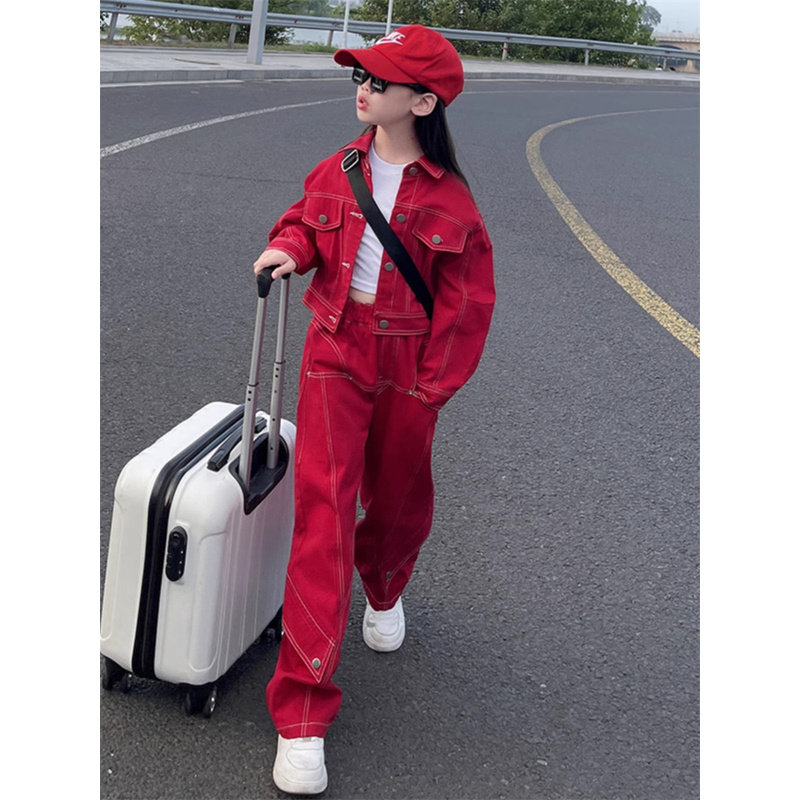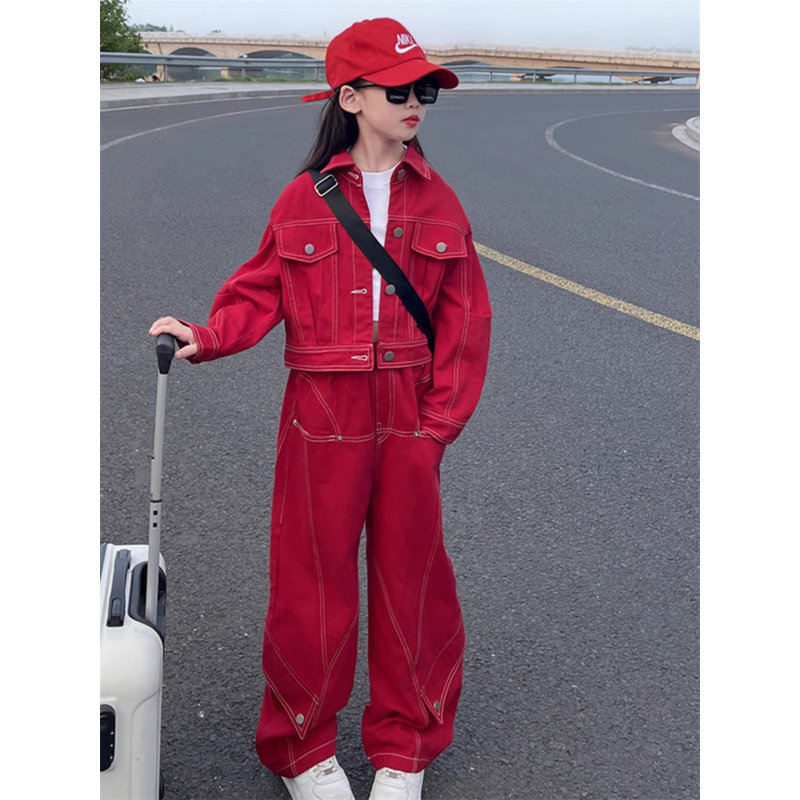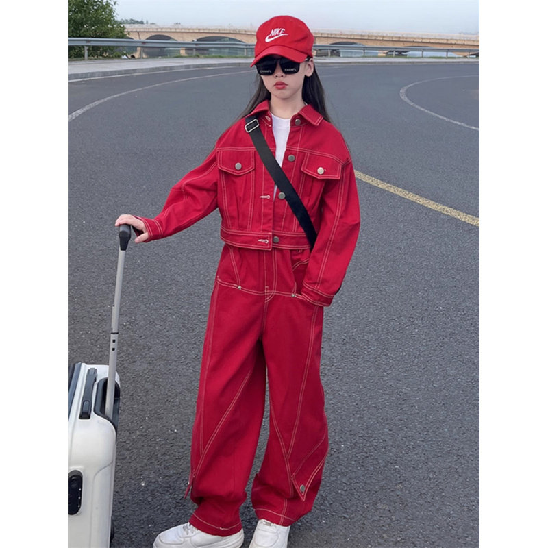 韩国Uamtor女童牛仔工装套装春秋新款时髦女孩中大童炸街洋气童装