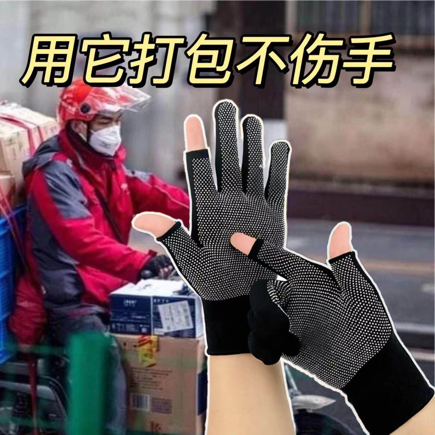 薄款打包手套专用快递员分拣劳保耐磨工作男女干活露二指防滑骑行