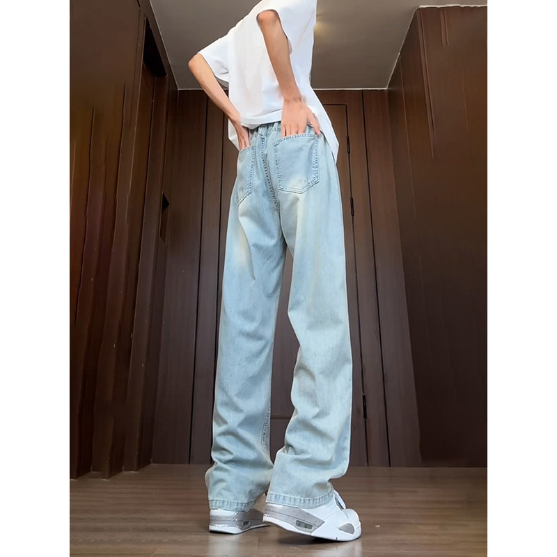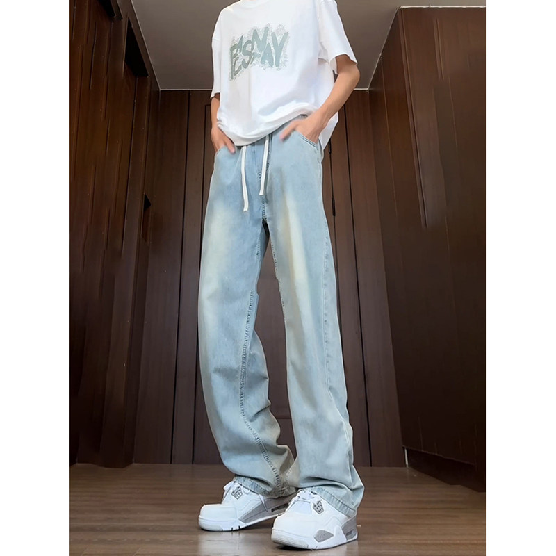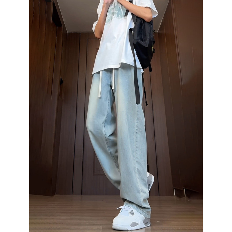 浅蓝色冰丝牛仔裤男薄款夏季直筒青少年裤子加长高个子抽绳阔腿裤