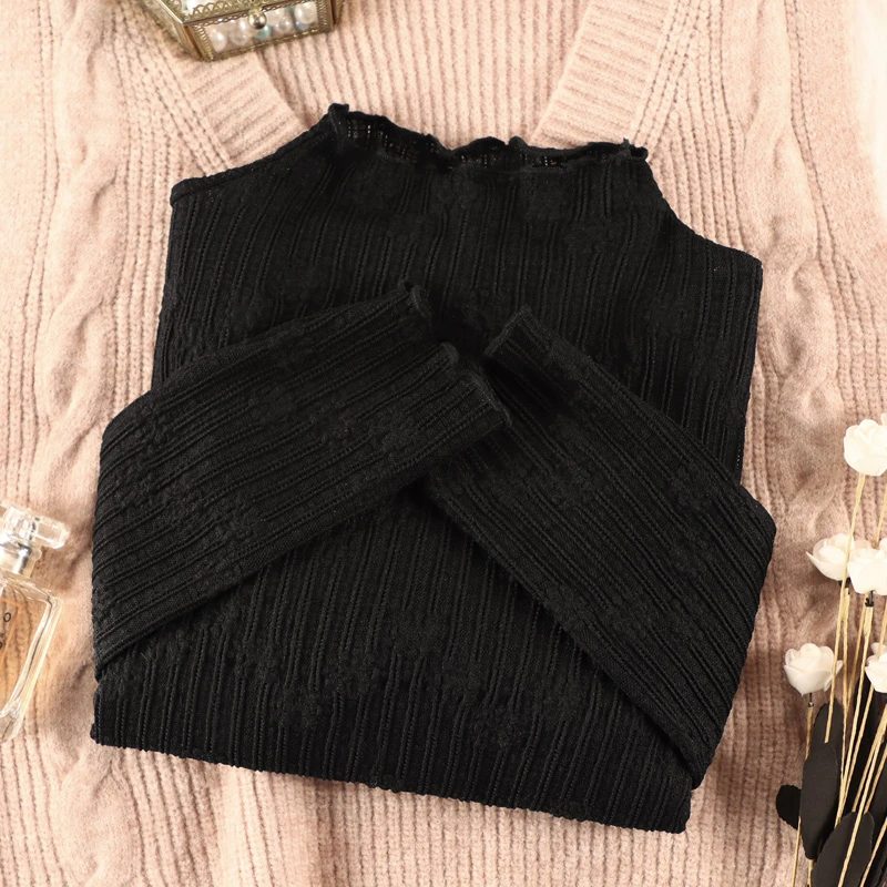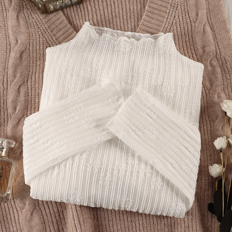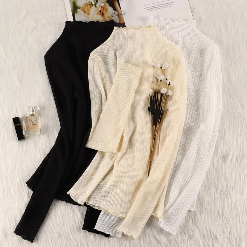 女款2023秋冬半高领薄款蕾丝洋气潮流高级感网纱内搭打底衫时髦小