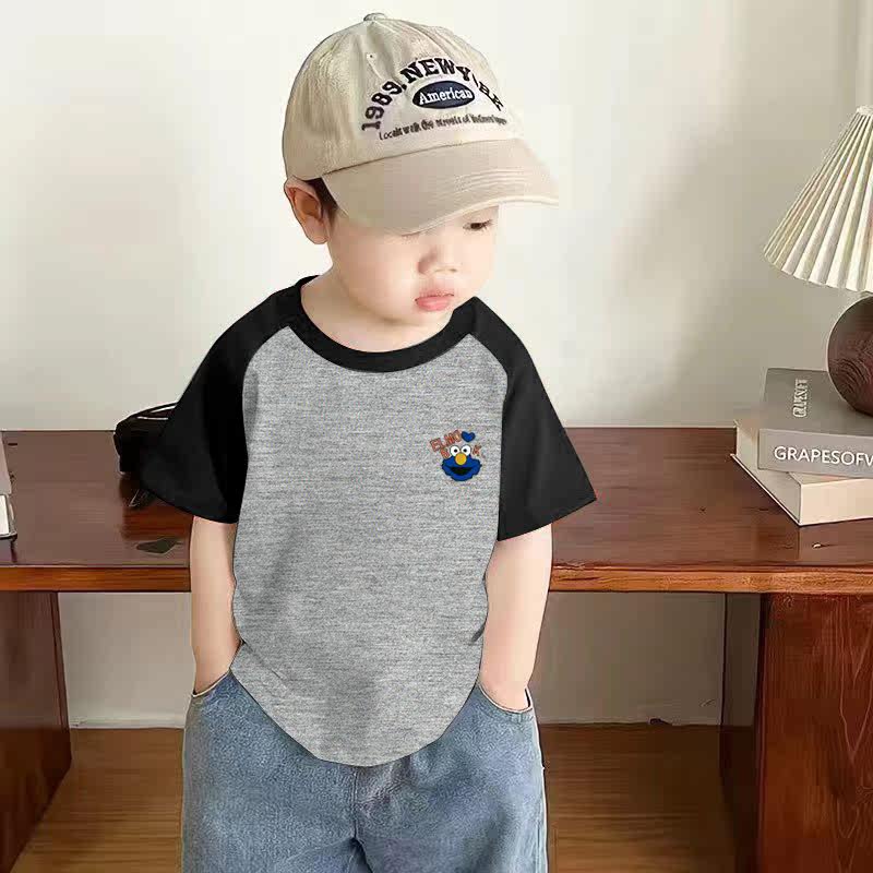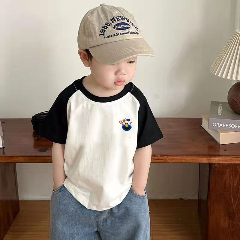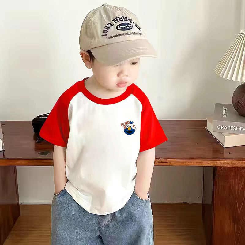 纯棉男童拼色插肩短袖T恤夏装新款中小儿童宝宝卡通帅气印花上衣