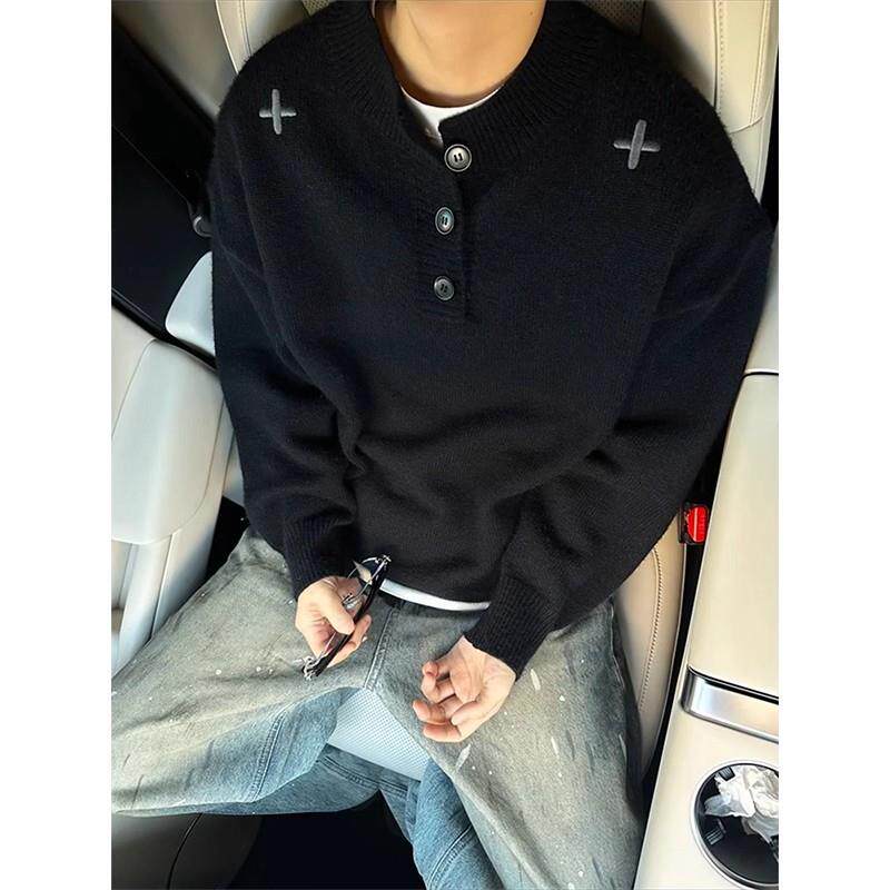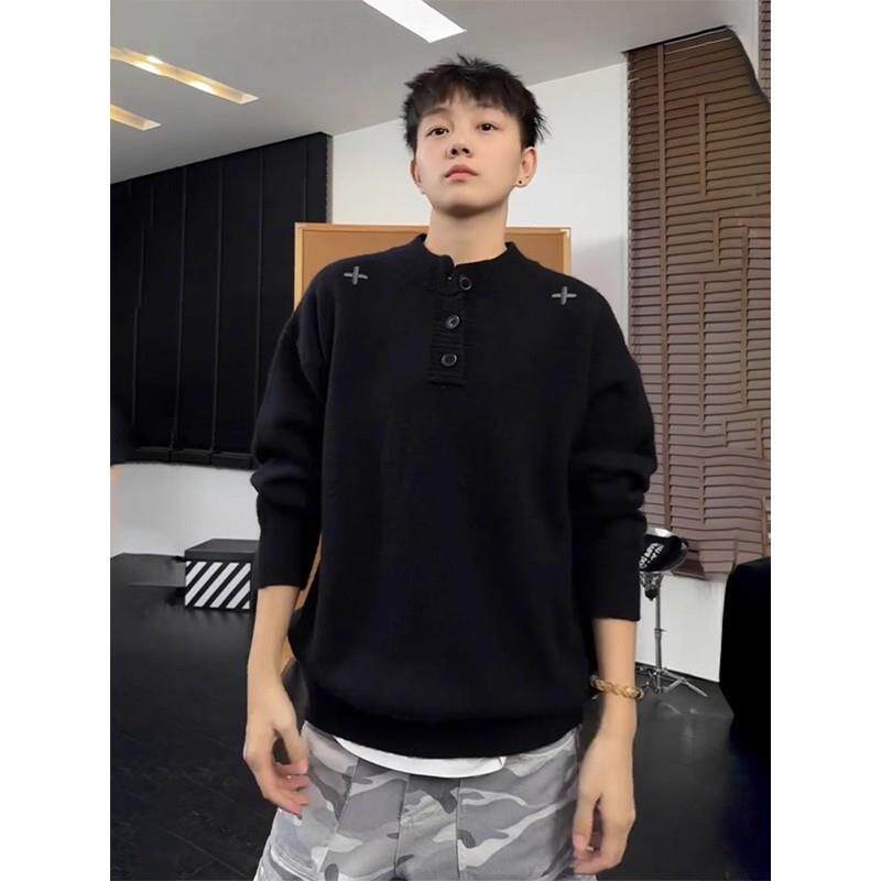 黑色美式亨利领毛衣男女款冬季慵懒高级感针织衫刺绣加厚打底内搭