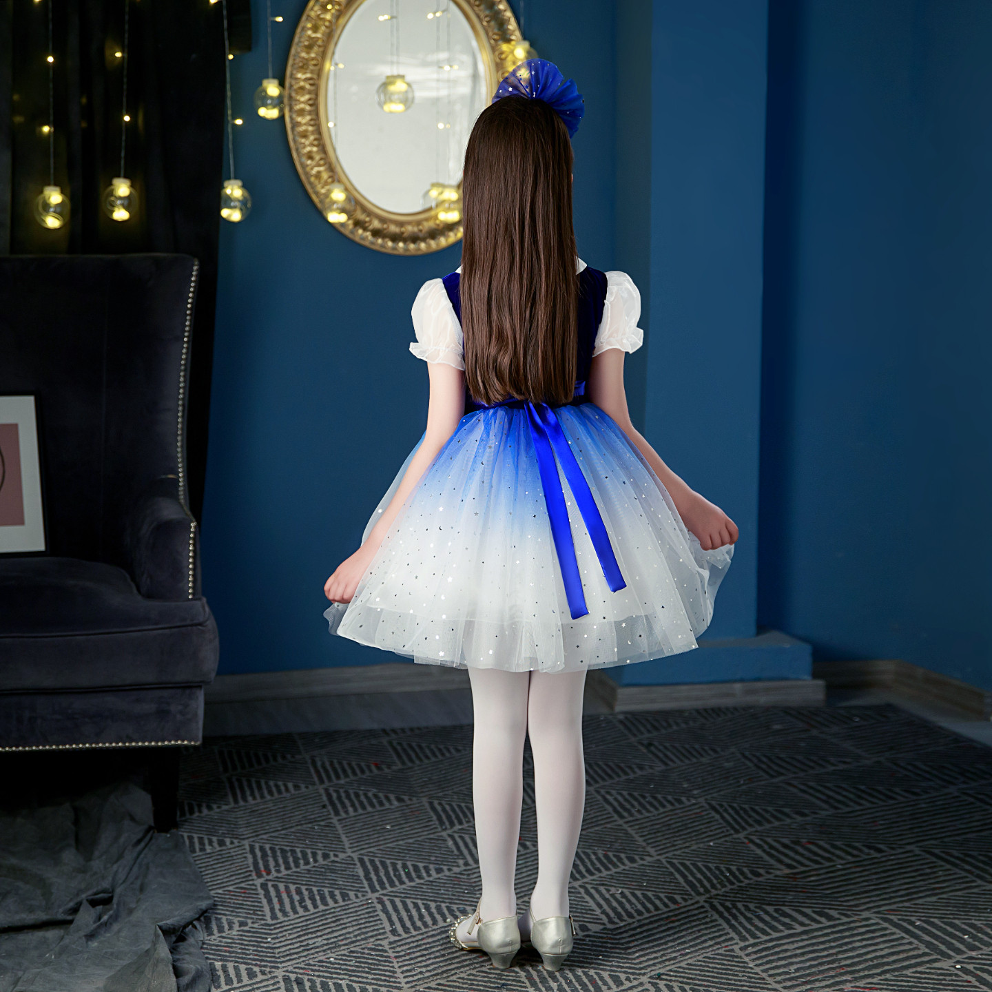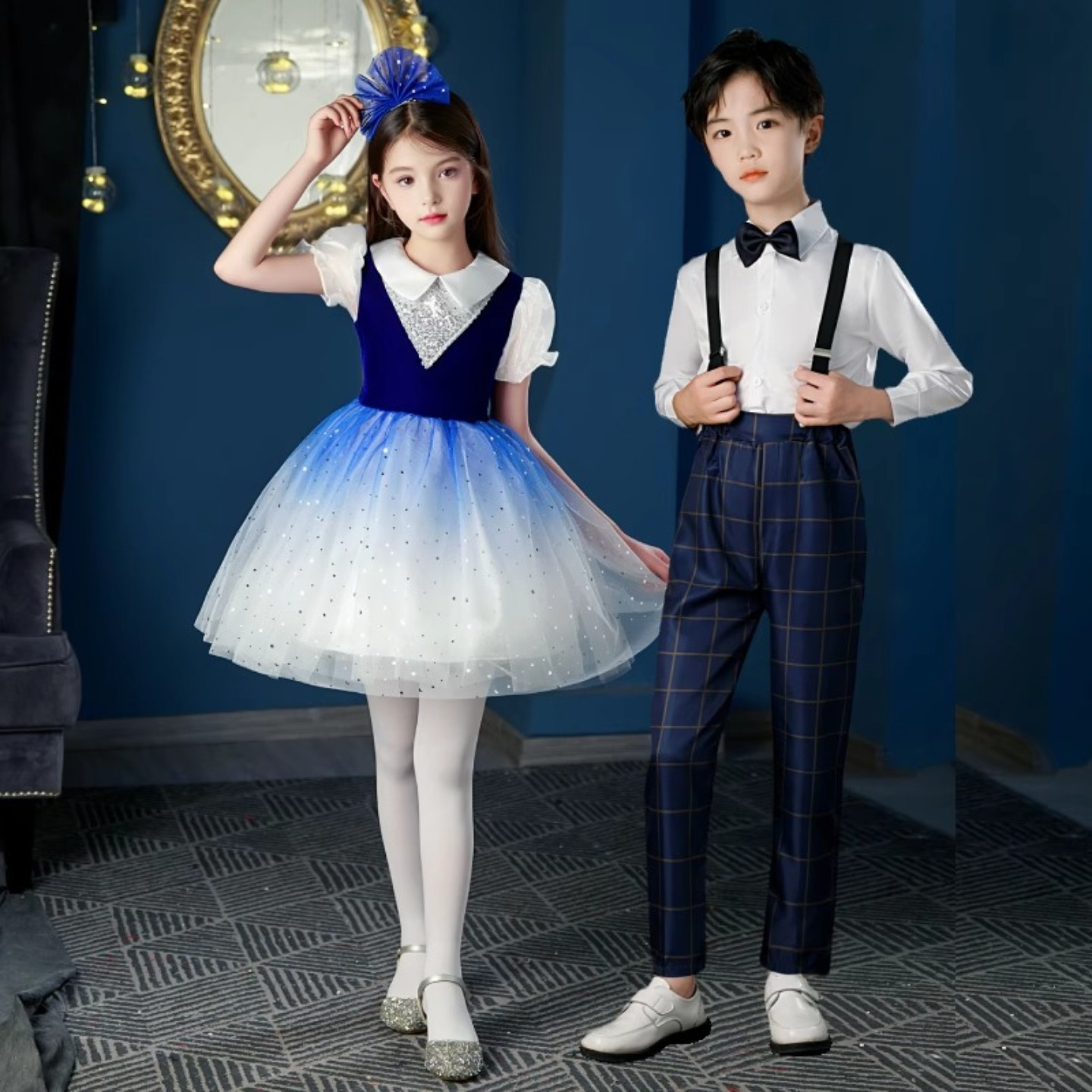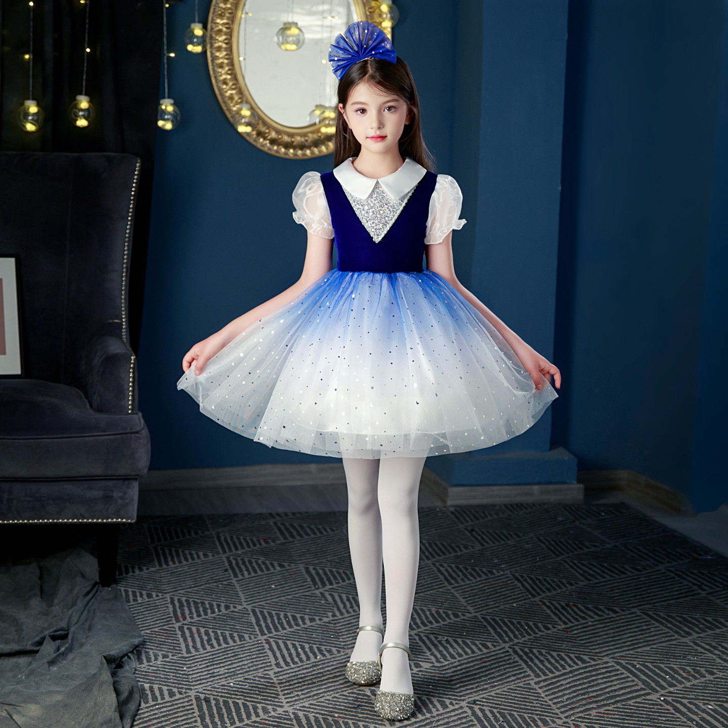 儿童演出服装蓬蓬裙小学生大合唱团比赛舞蹈服女童泡泡袖纱裙蓝色