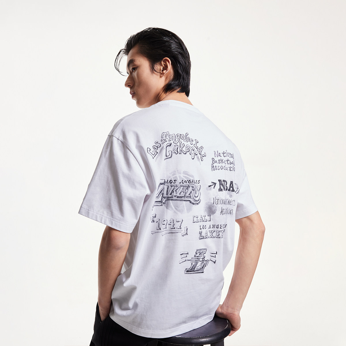 311线报网描述:略宽松版型;罗纹圆领;洛杉矶湖人涂鸦印花