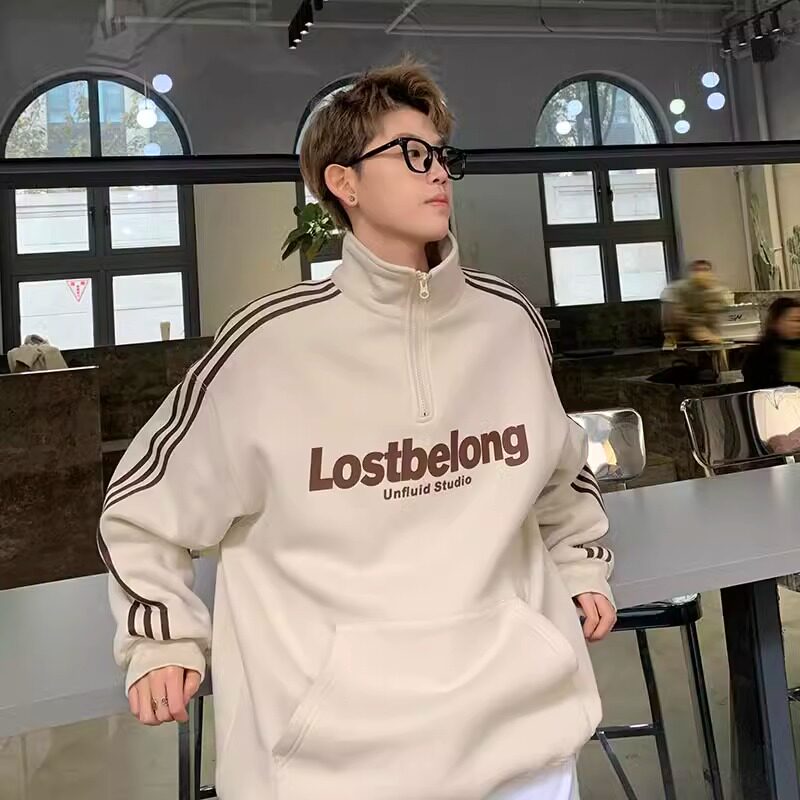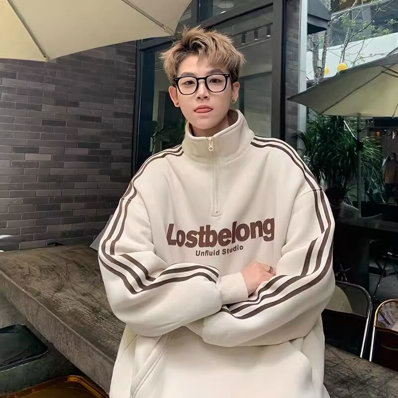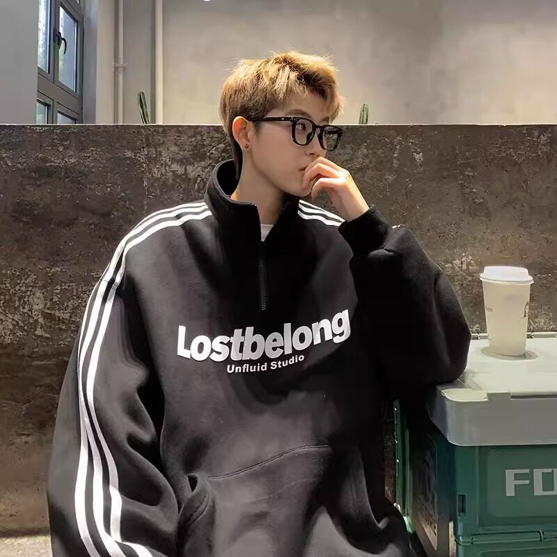大码300斤加绒加厚半拉链立领卫衣男秋冬无帽美式青少年潮牌外套2
