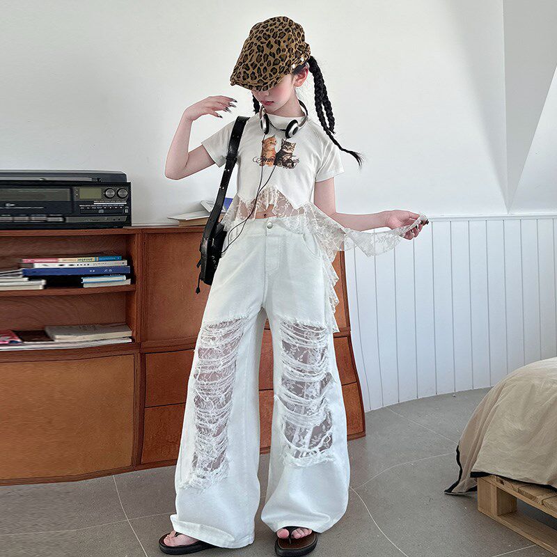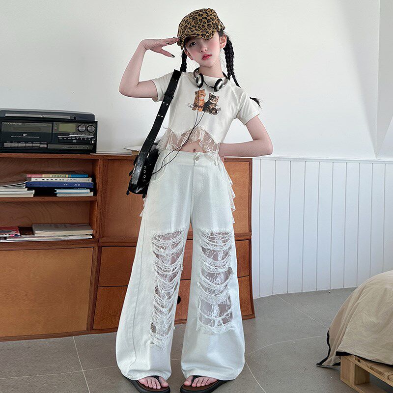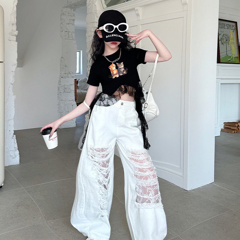 女童春夏款破洞牛仔裤2025新款女大童夏季阔腿裤儿童薄款直筒裤子