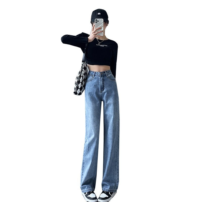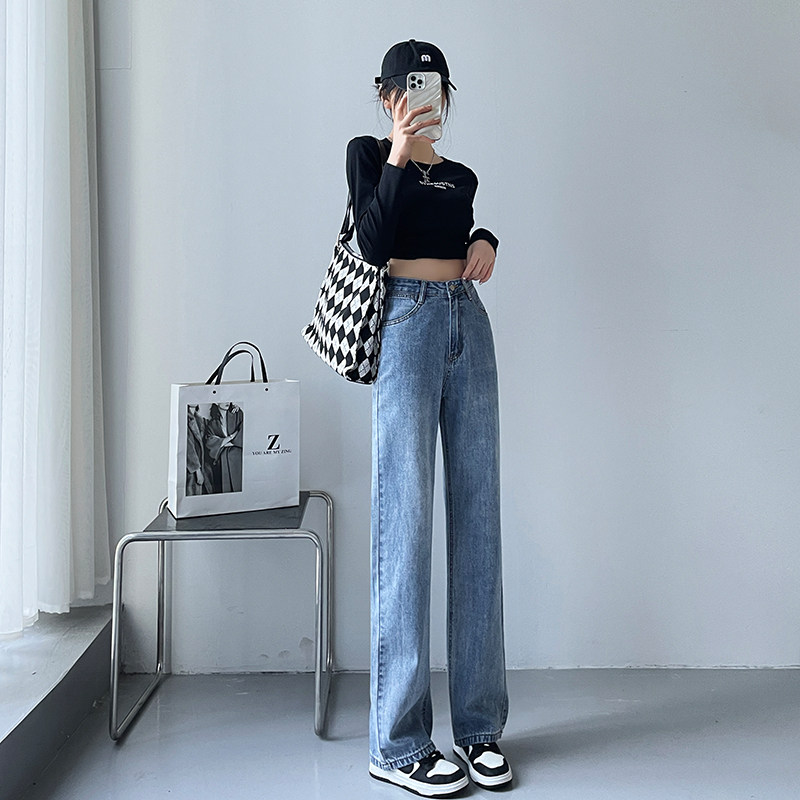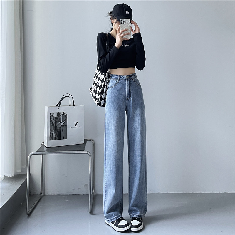 高腰浅蓝色窄版阔腿牛仔裤女2026年新款夏季薄款小个子宽松直筒裤
