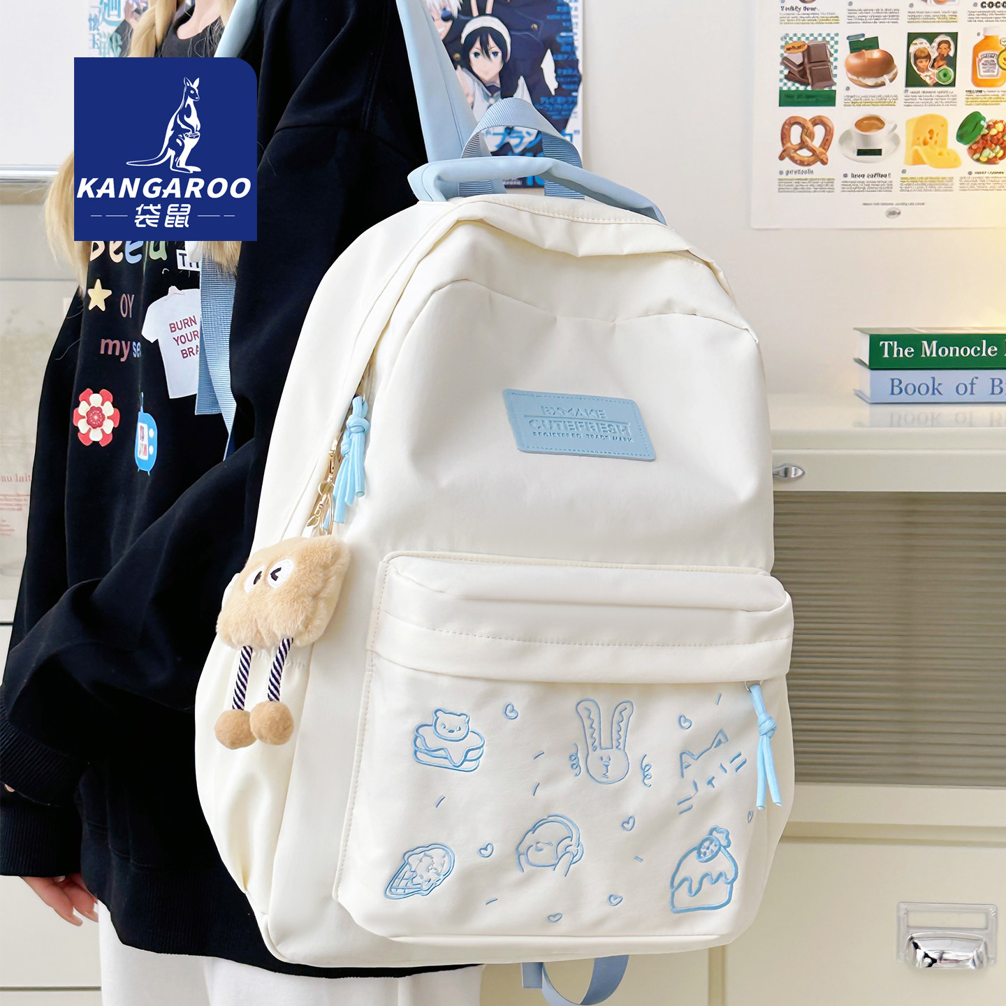 袋鼠双肩包 简约书包初中女生ins风大容量高中生紫色刺绣防水背包