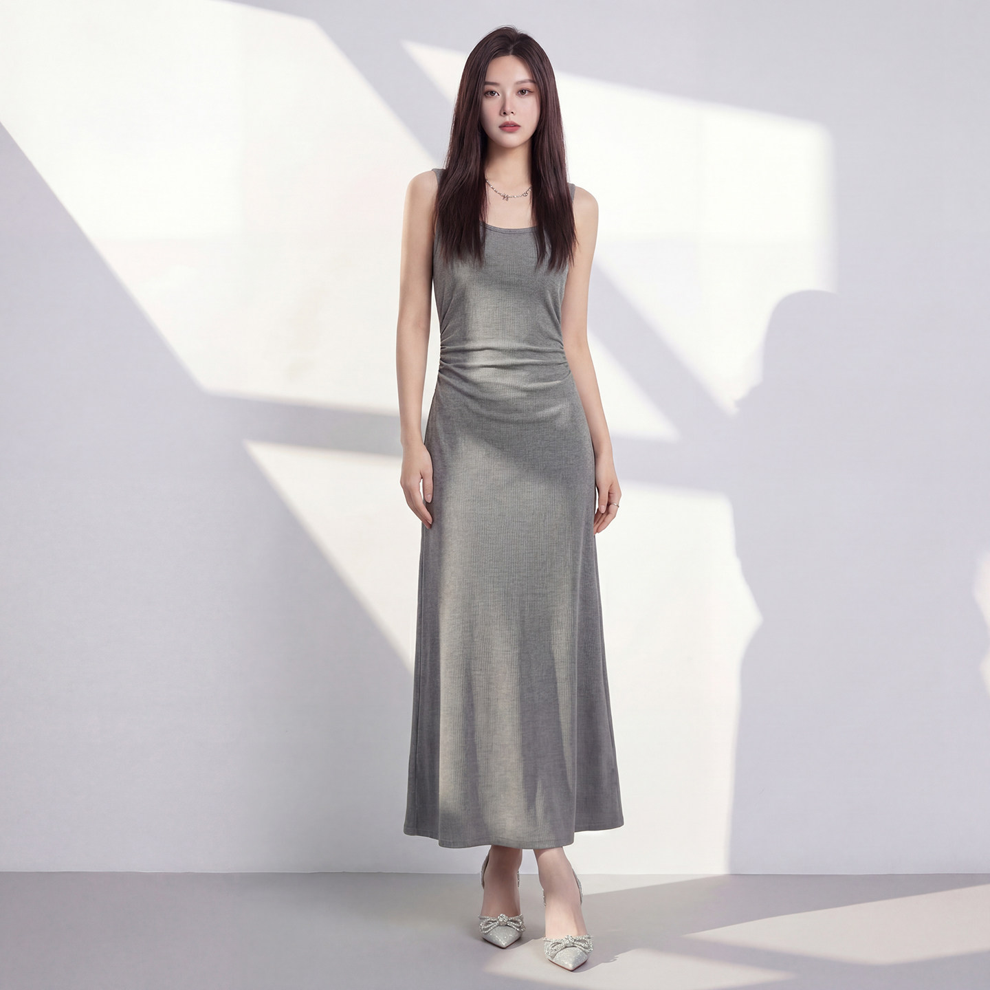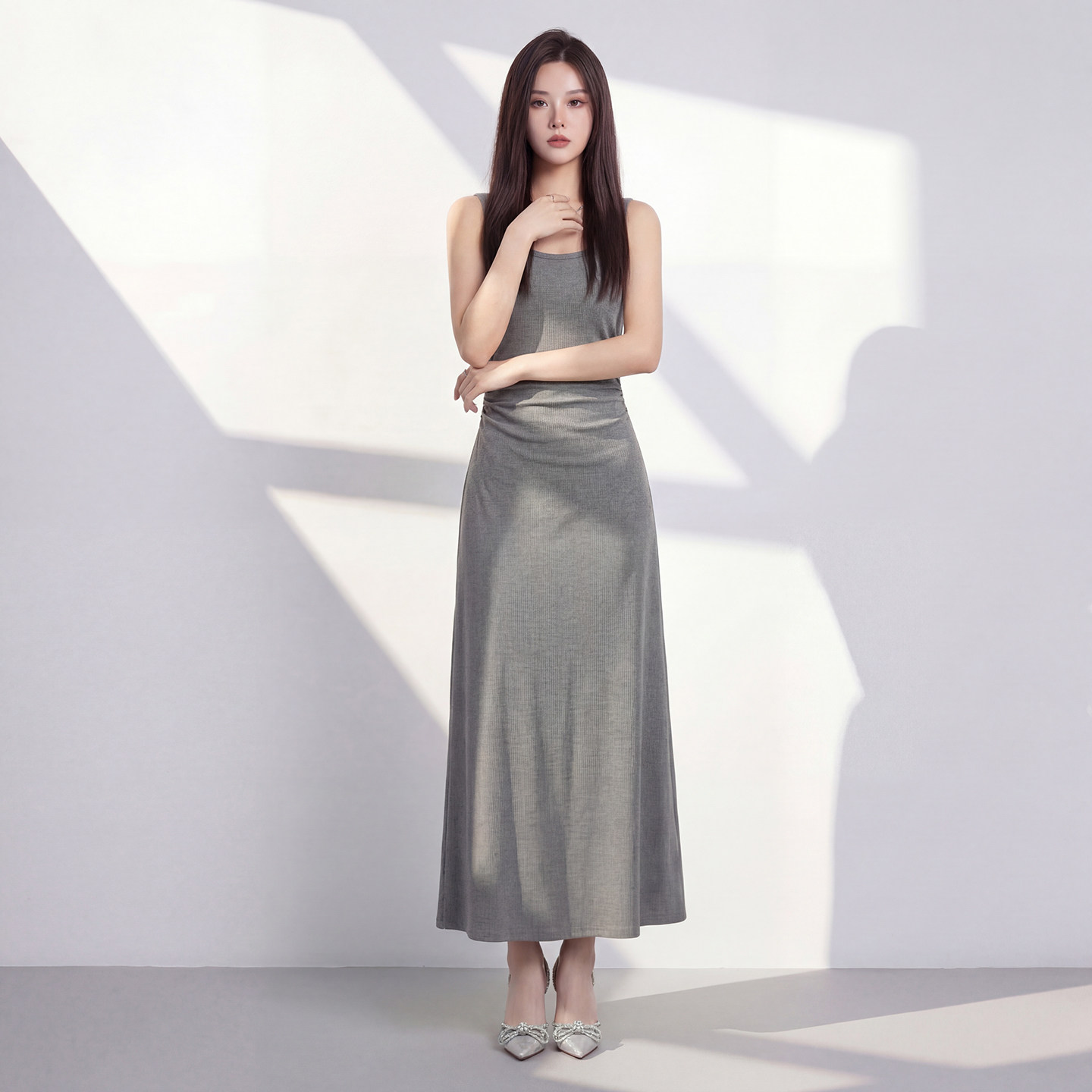 艾格简约高级灰色方领吊带长裙女修身显瘦大摆连衣裙日常通勤裙子