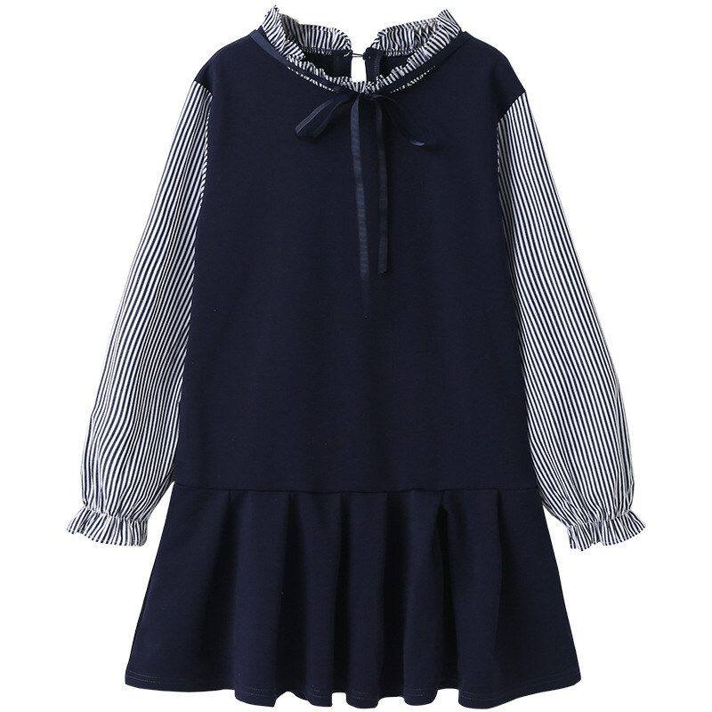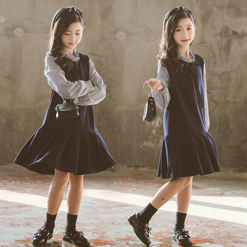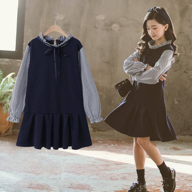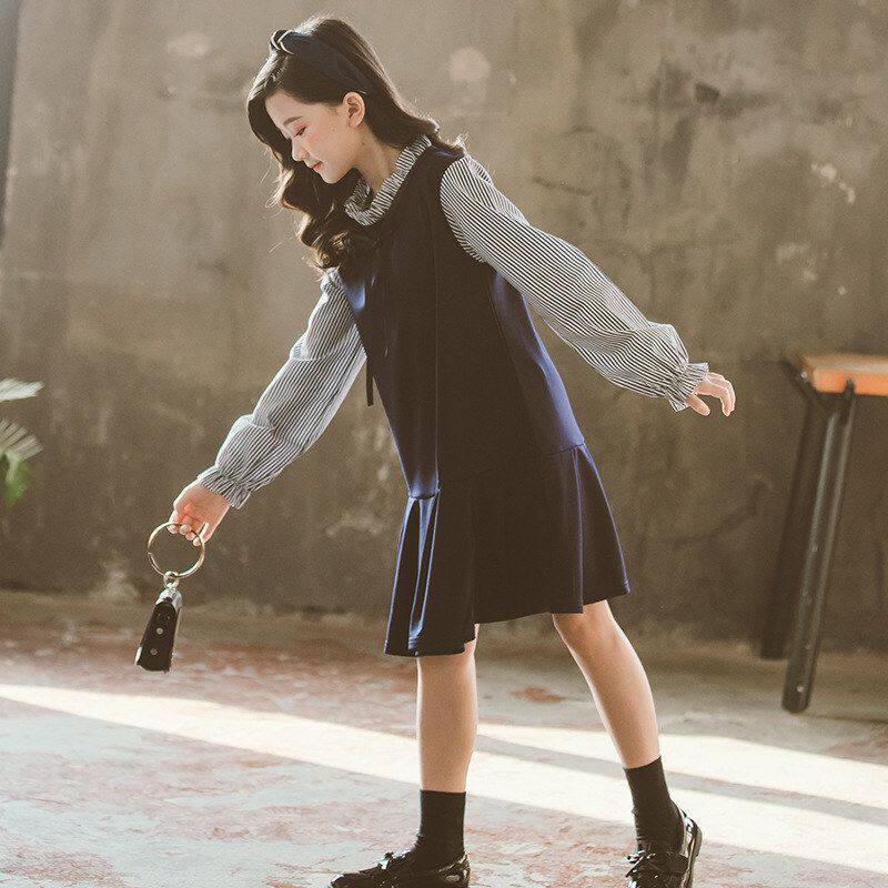 女童2026春装连衣裙新款时尚洋气小女孩长袖裙子中大童拼条纹中裙