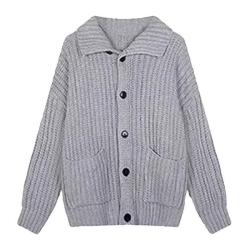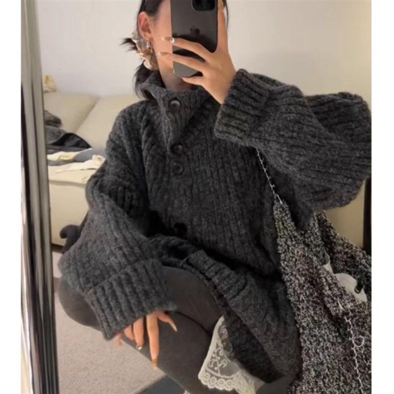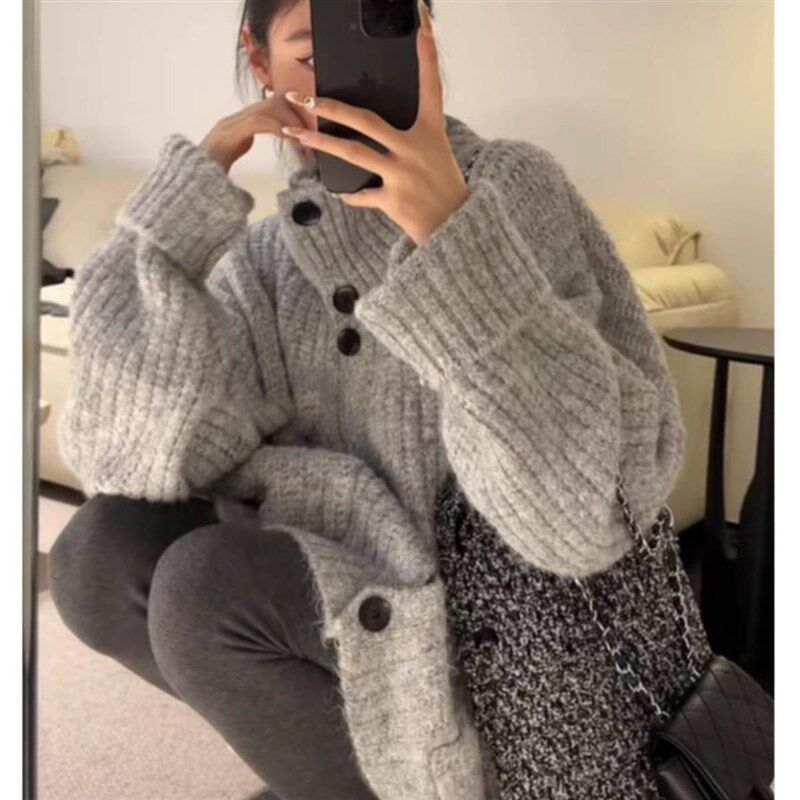 灰色翻领毛衣外套女秋冬加厚宽松外D穿慵懒风高级感中长款针织开