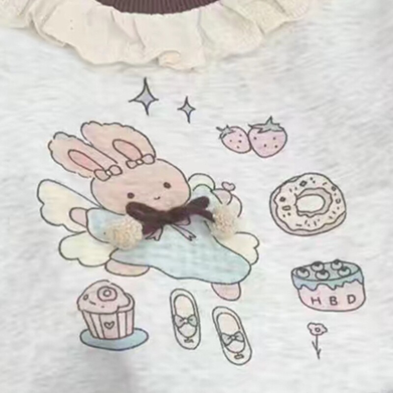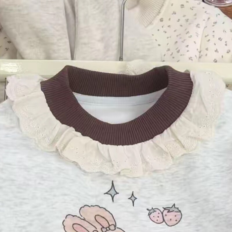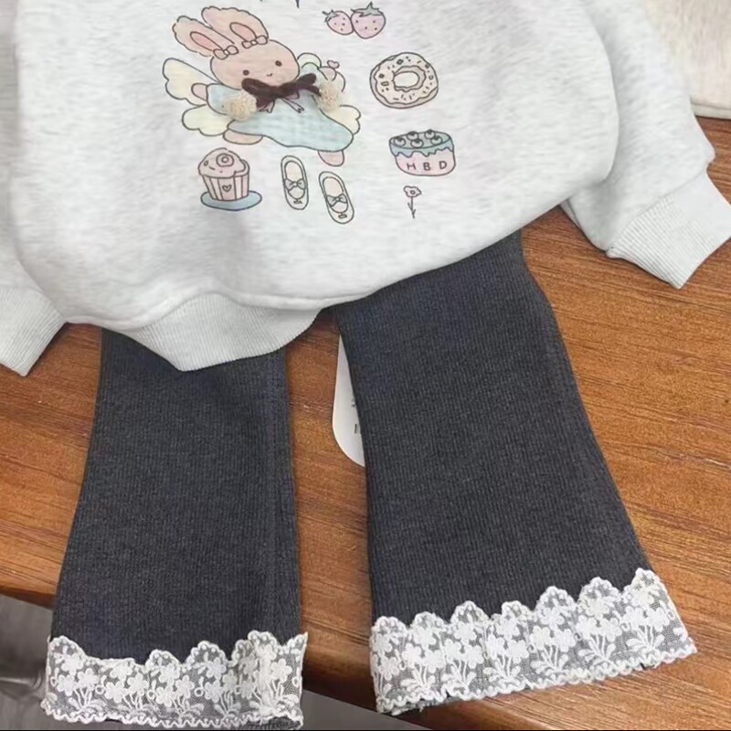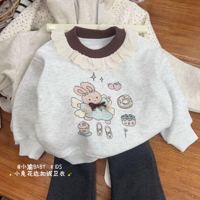 女童加绒套装秋冬新款韩版可爱一体绒小兔子花边卫衣微喇裤两件套
