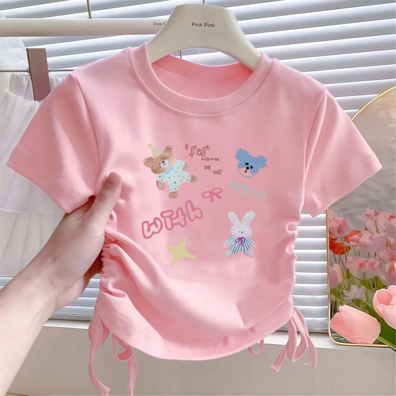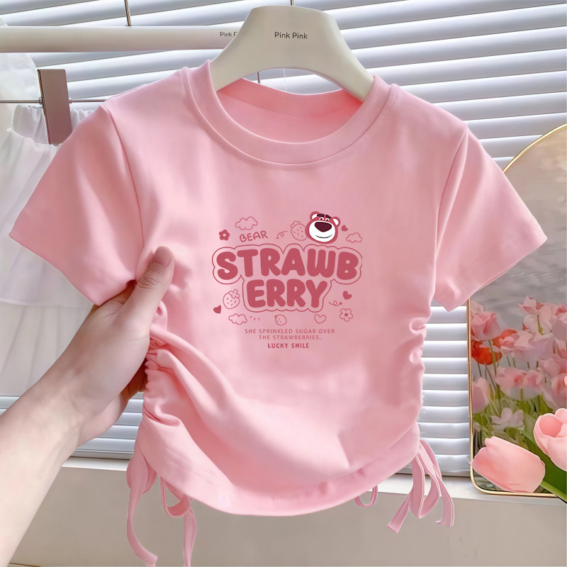韩系卡通宝宝短袖t恤2026新款夏季纯棉圆领透气女童短款抽绳上衣