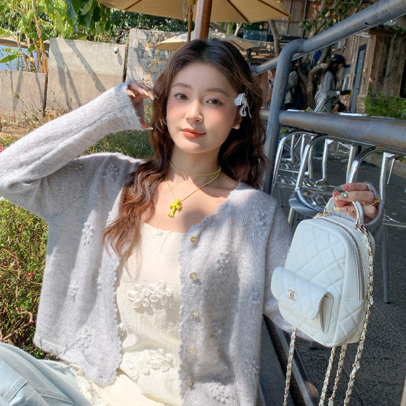 紫色羊毛针织开衫外套女装2026春夏季新款独特漂亮薄款外搭小上衣