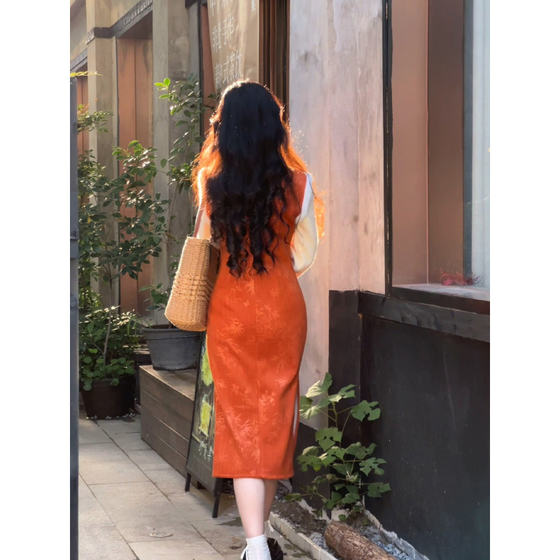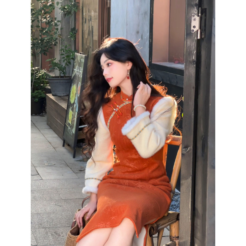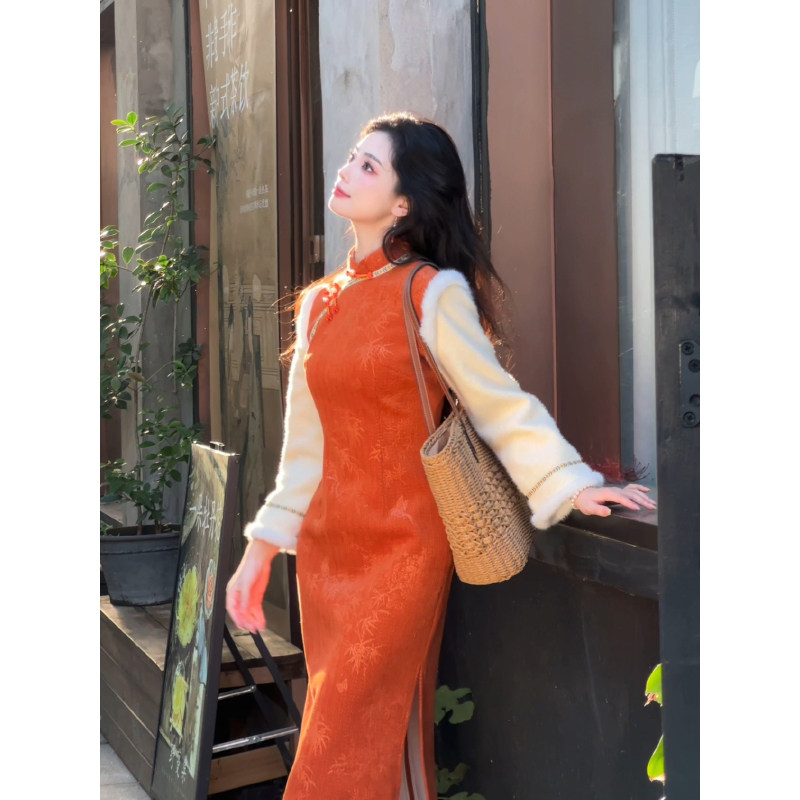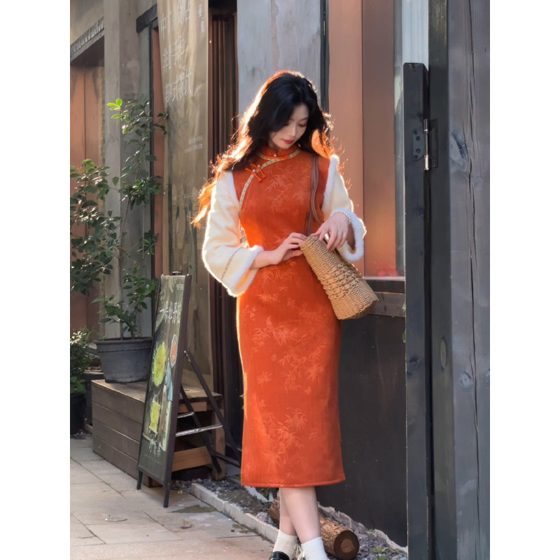 故双栖【暮色晓】秋冬改良旗袍女新中式小个子长袖连衣裙加绒加厚