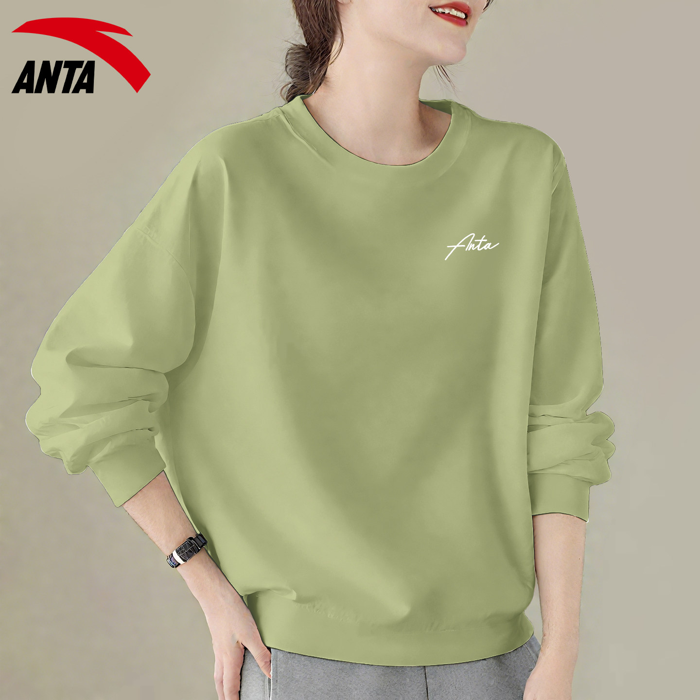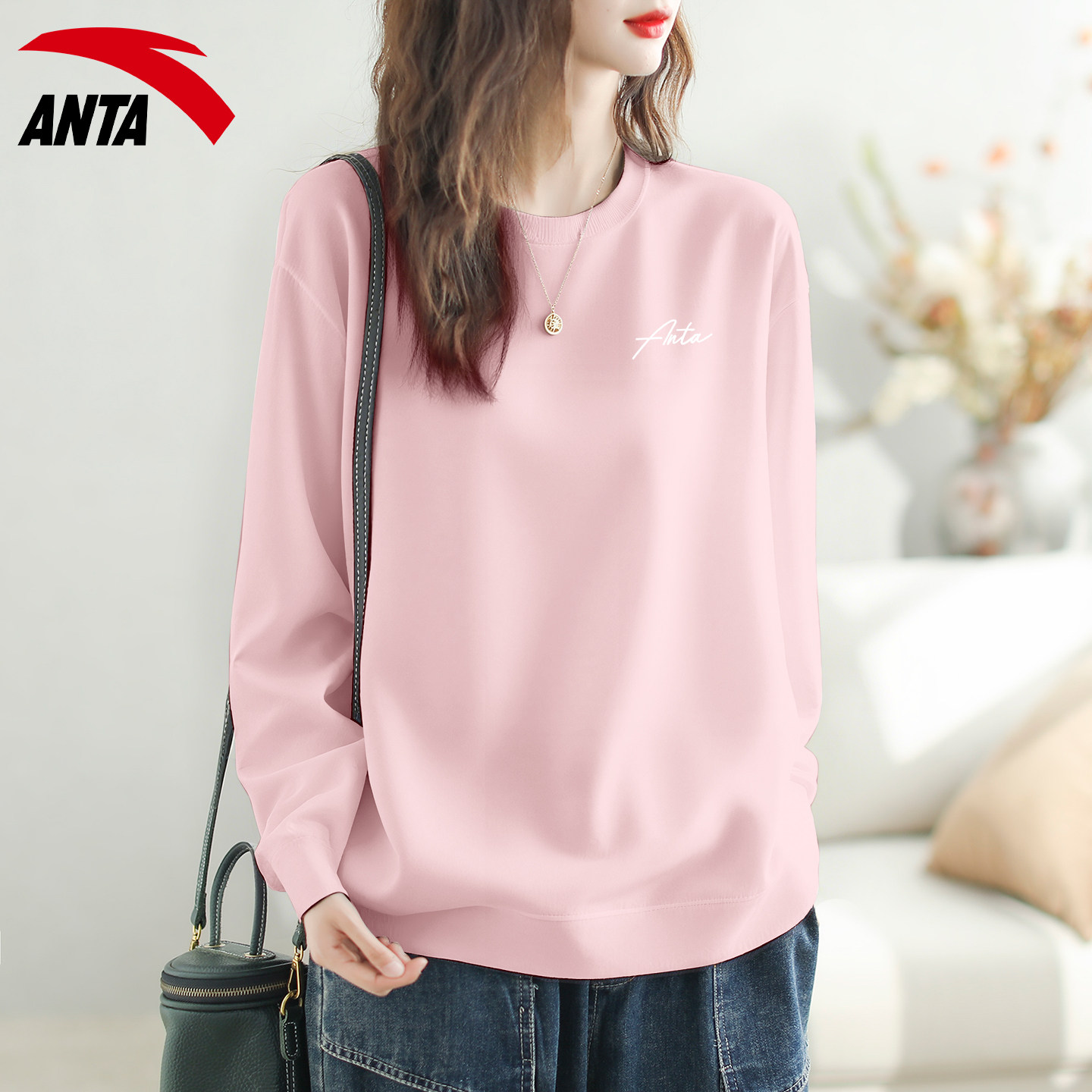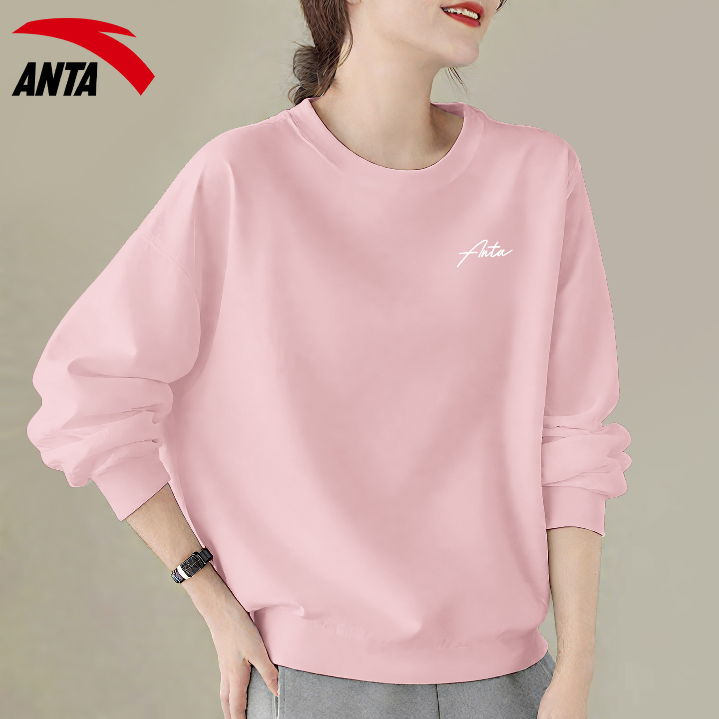 安踏卫衣女粉色学生显白正肩显瘦宽松2026春季新款圆领长袖打底衫