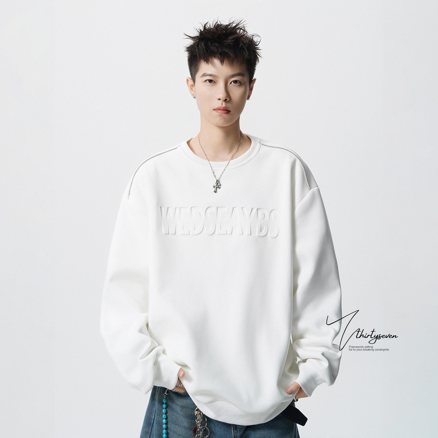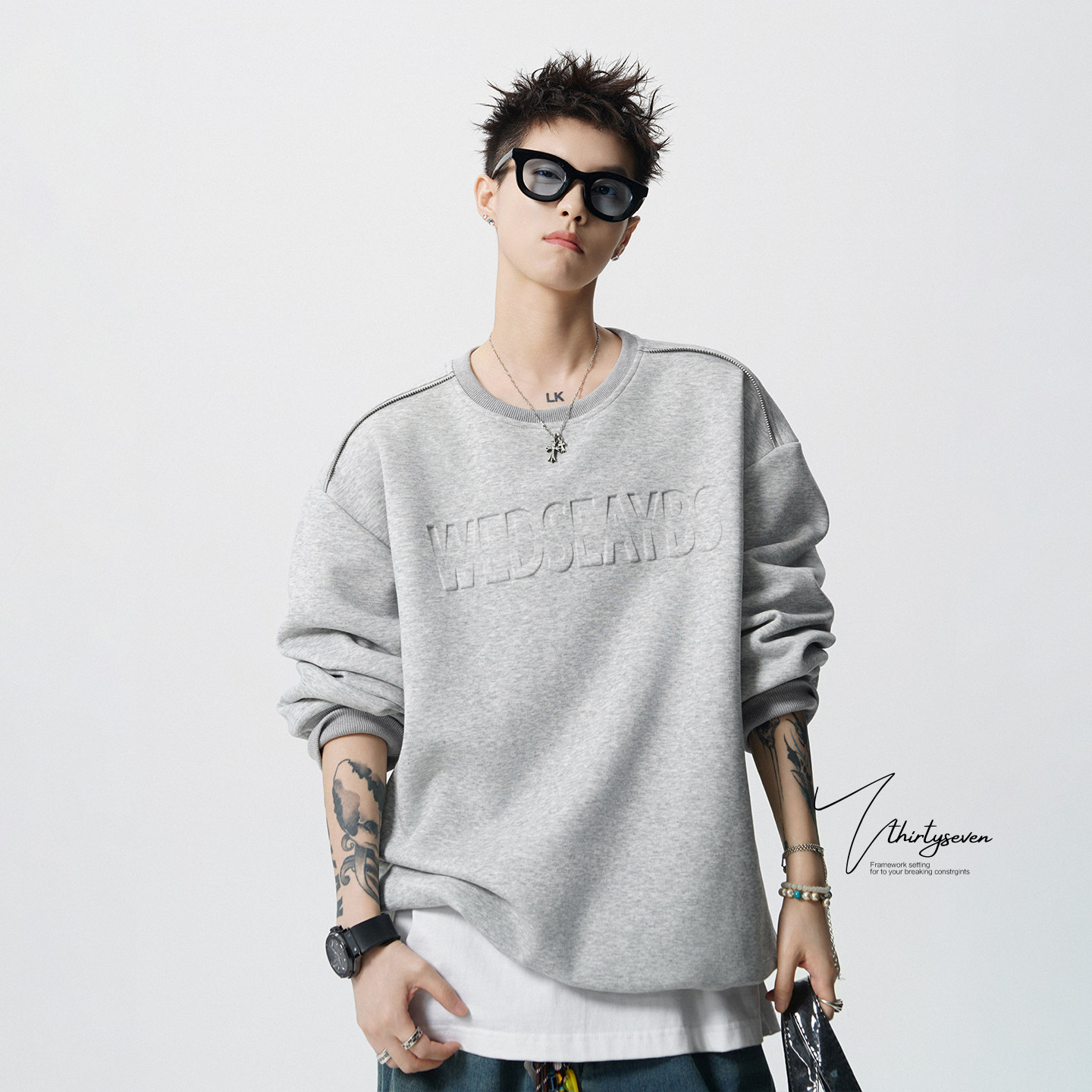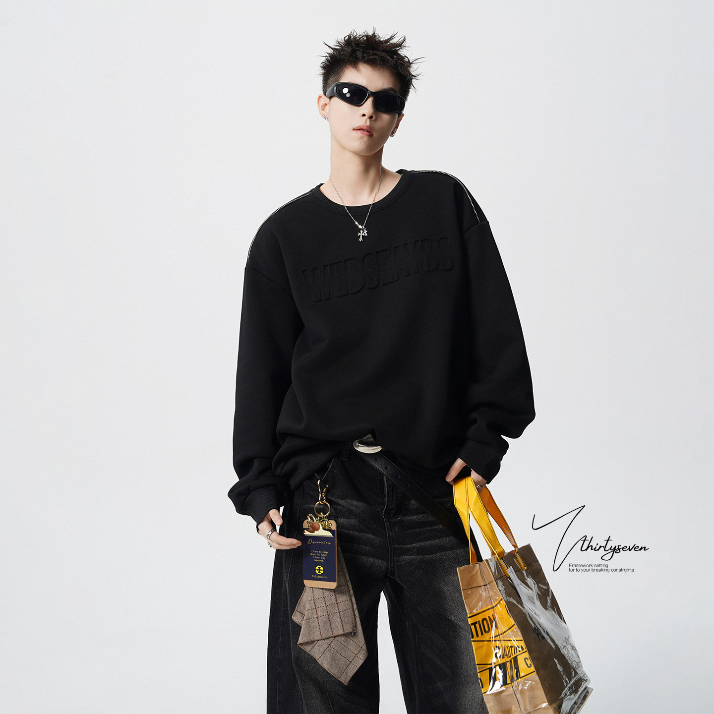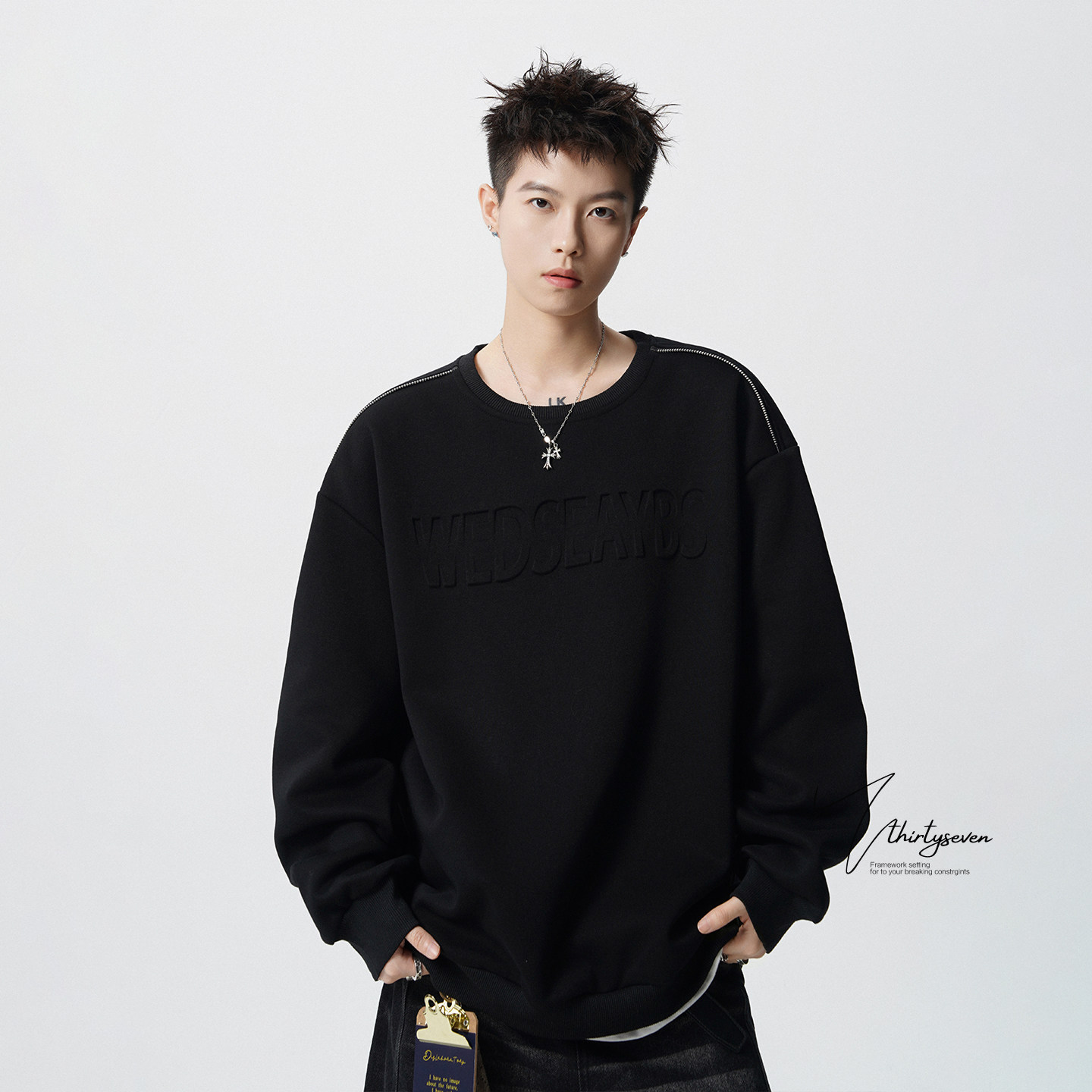V37美式凹凸字母圆领潮流卫衣男春季重磅设计感青少年拉链上衣潮