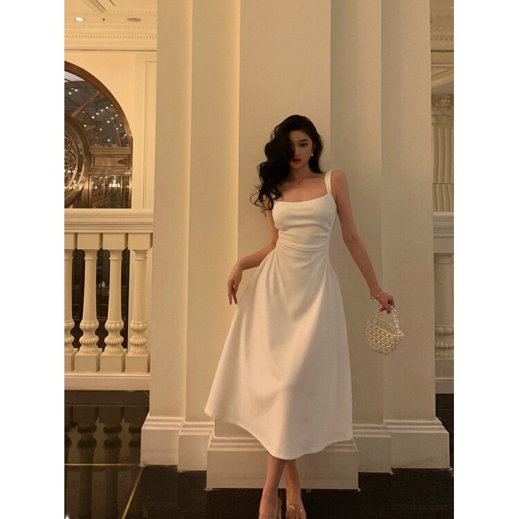 法式白色吊带连衣裙女2025新款收腰裙子高级感领证礼服长裙小个子