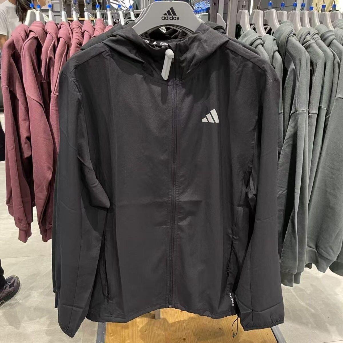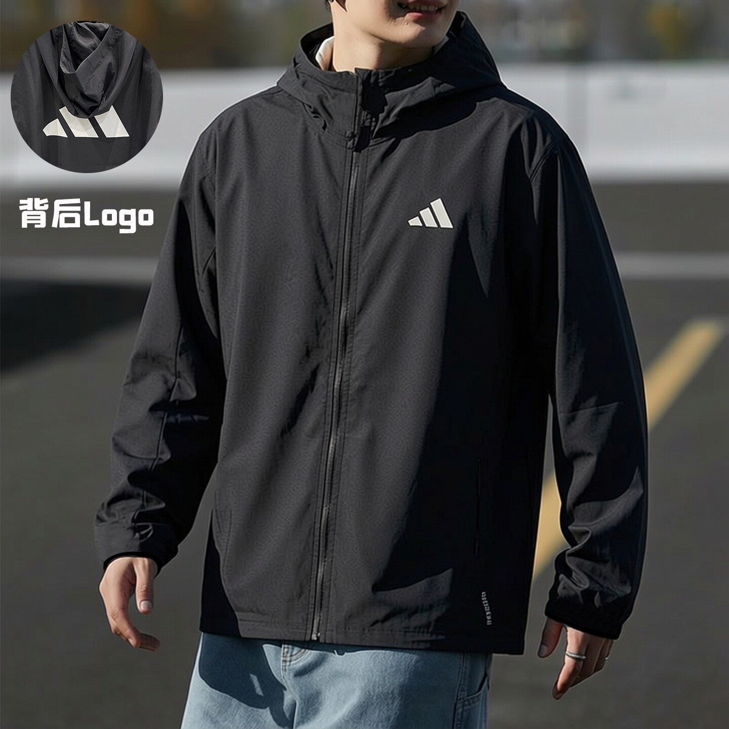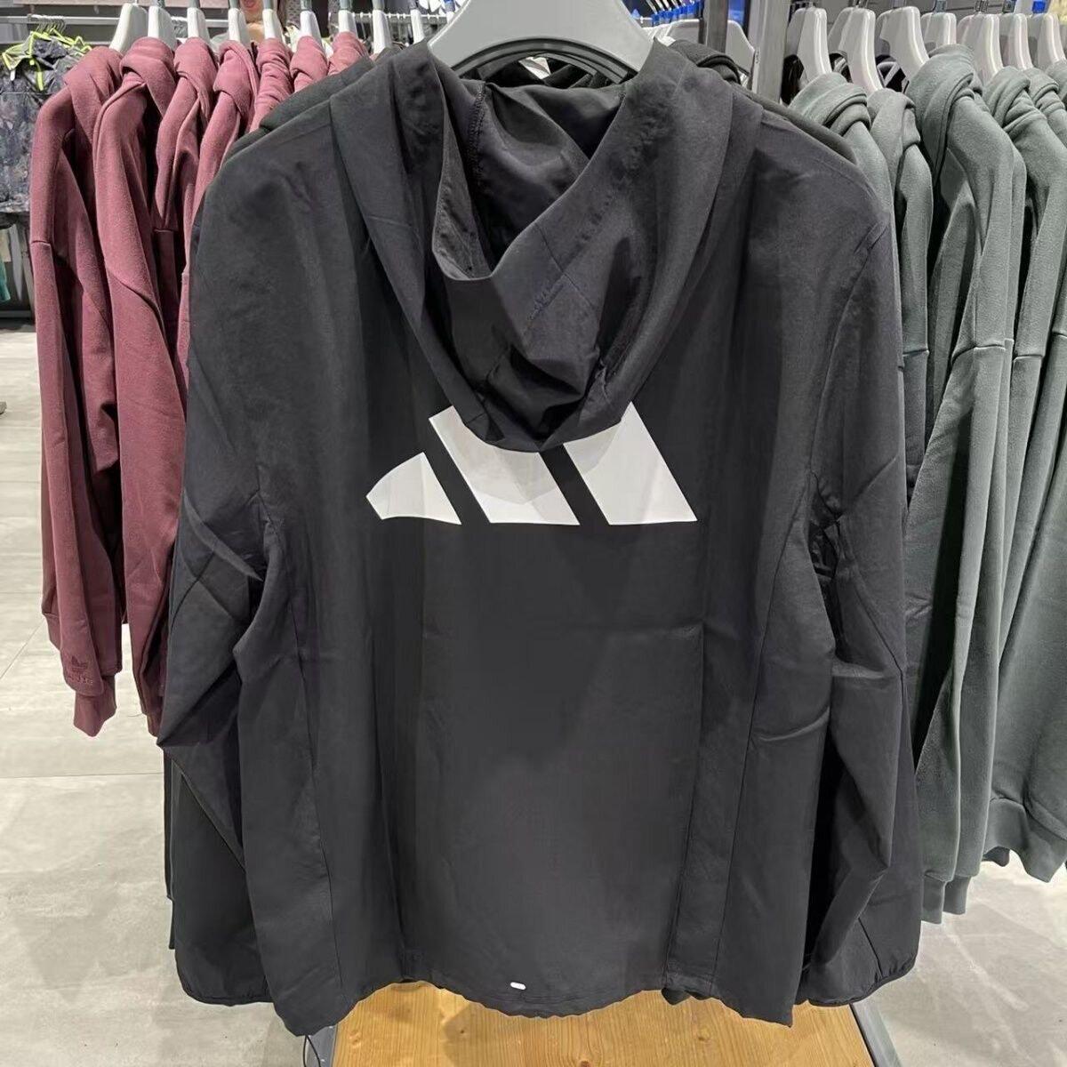 阿迪达斯薄款外套男春季新款透气宽松连帽夹克户外黑色梭织防风衣