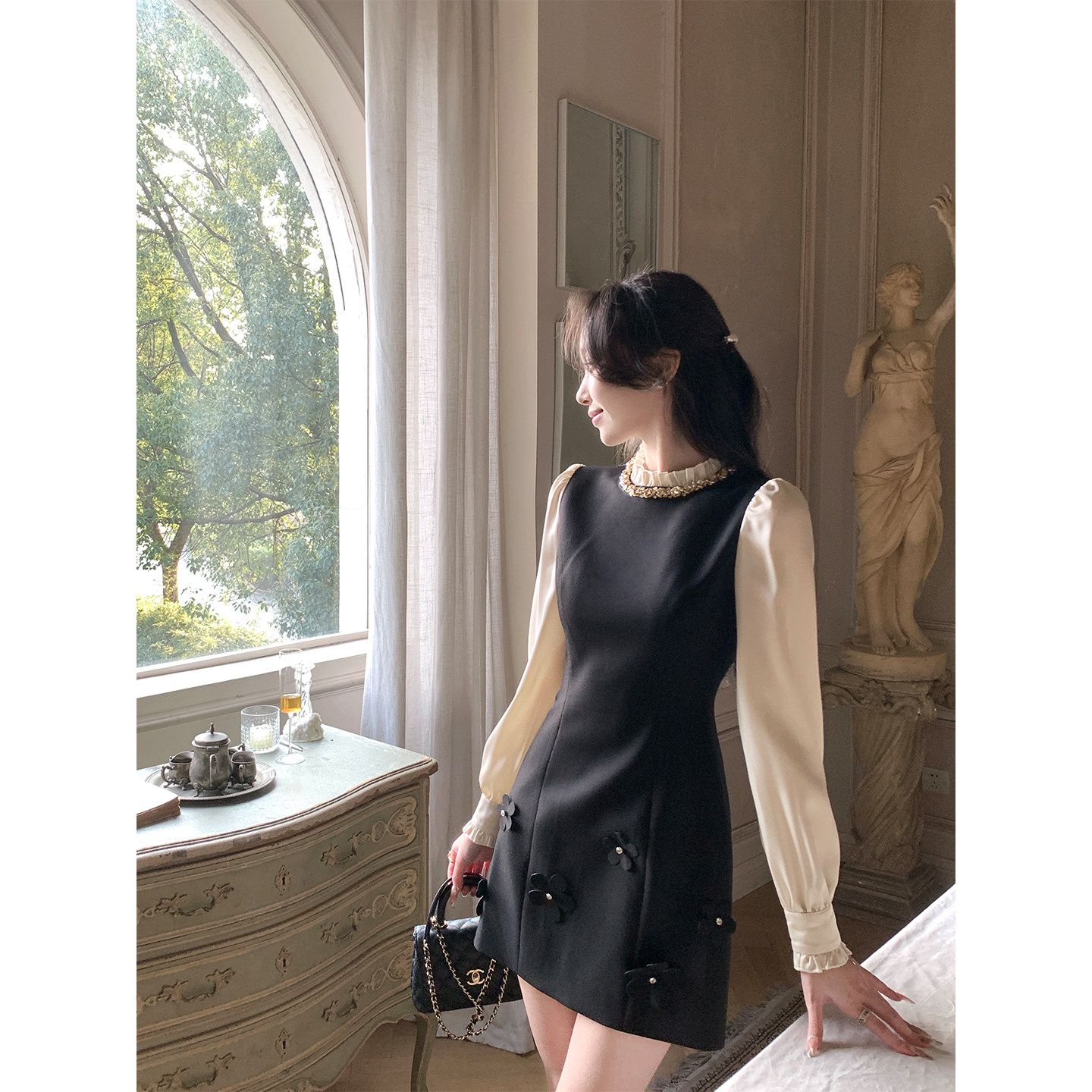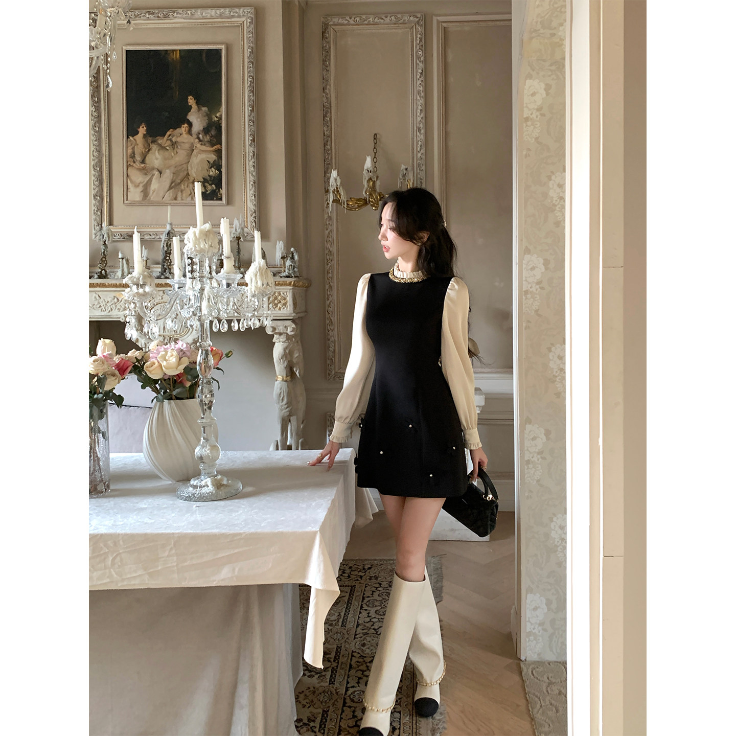 韩语琳 法式千金风长袖连衣裙女2026黑色气质小香风短款礼服裙子