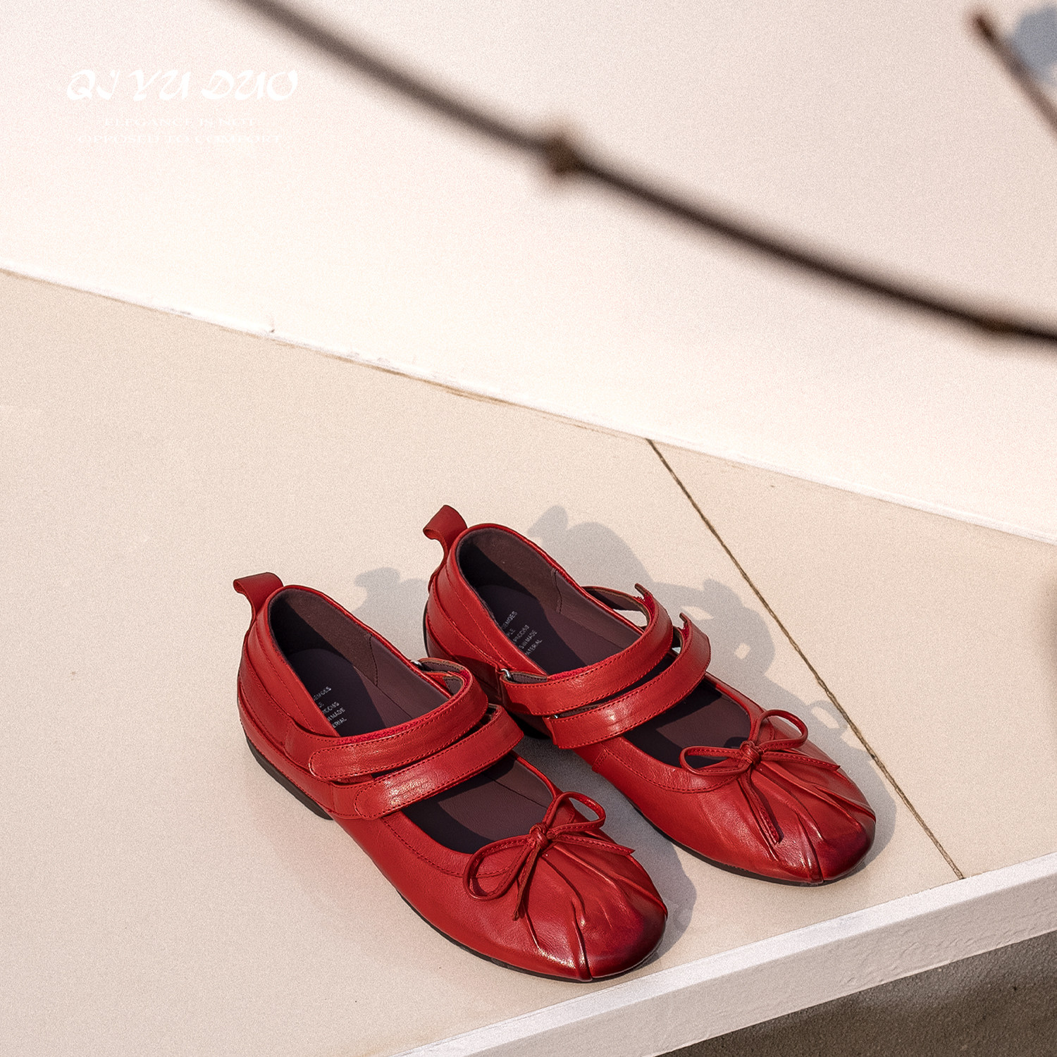 QIYUDUO 红色玛丽珍鞋女真皮软底内增高浅口单鞋复古蝴蝶结芭蕾鞋
