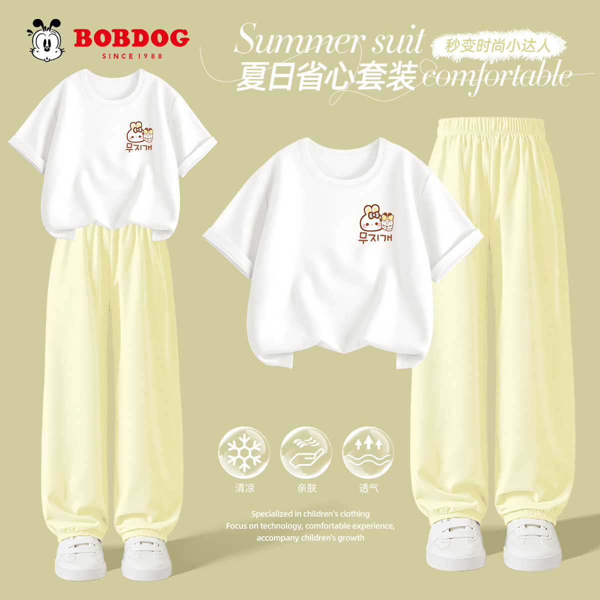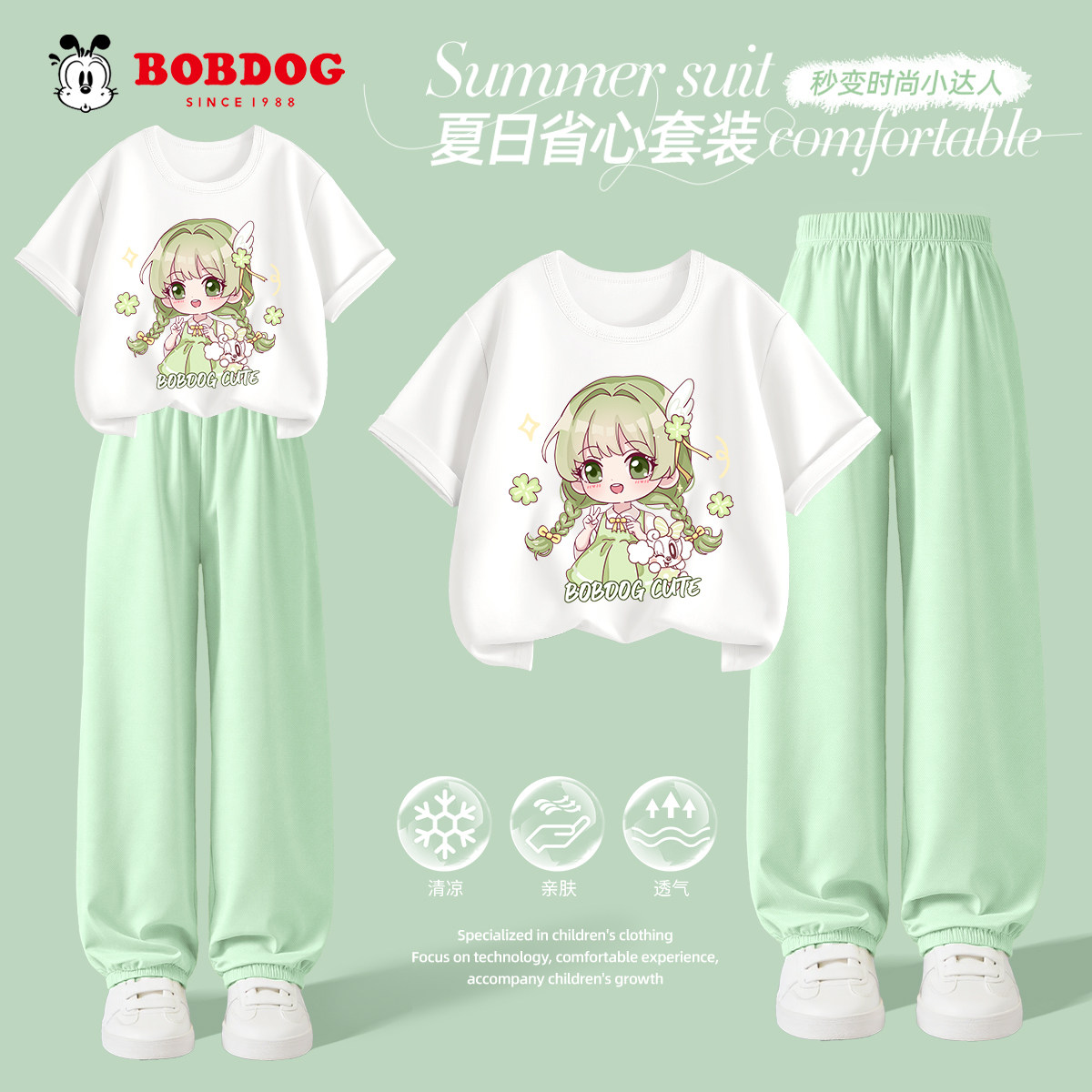巴布豆童装女童套装夏季新款中大童纯棉短袖儿童冰丝速干运动裤薄