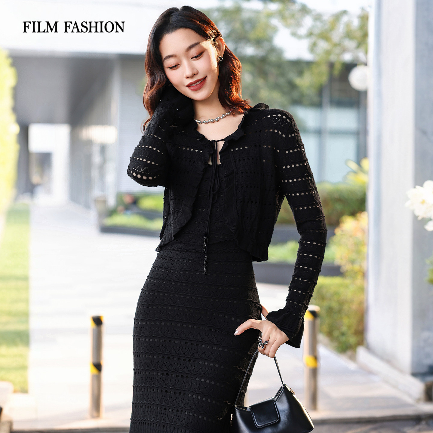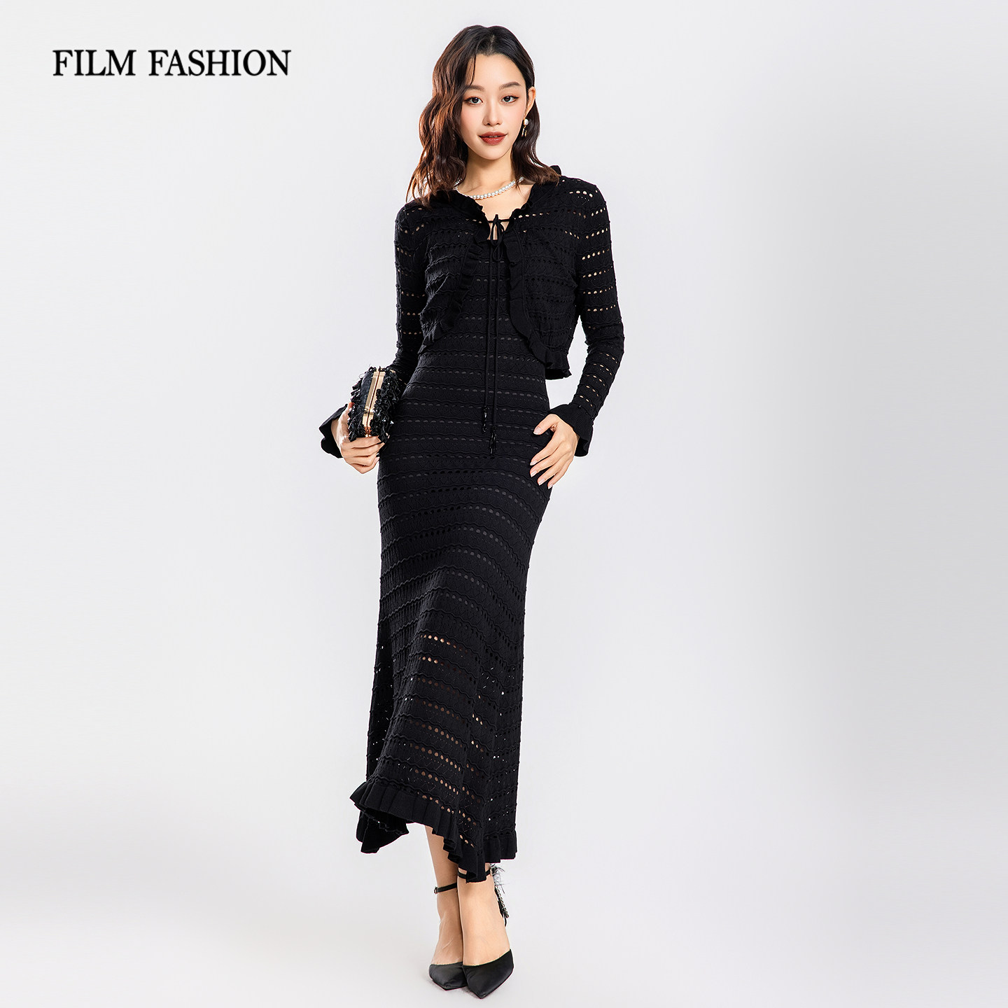 一电影一时装春季新款连衣裙套装镂空黑色长袖显瘦女士(两件套)