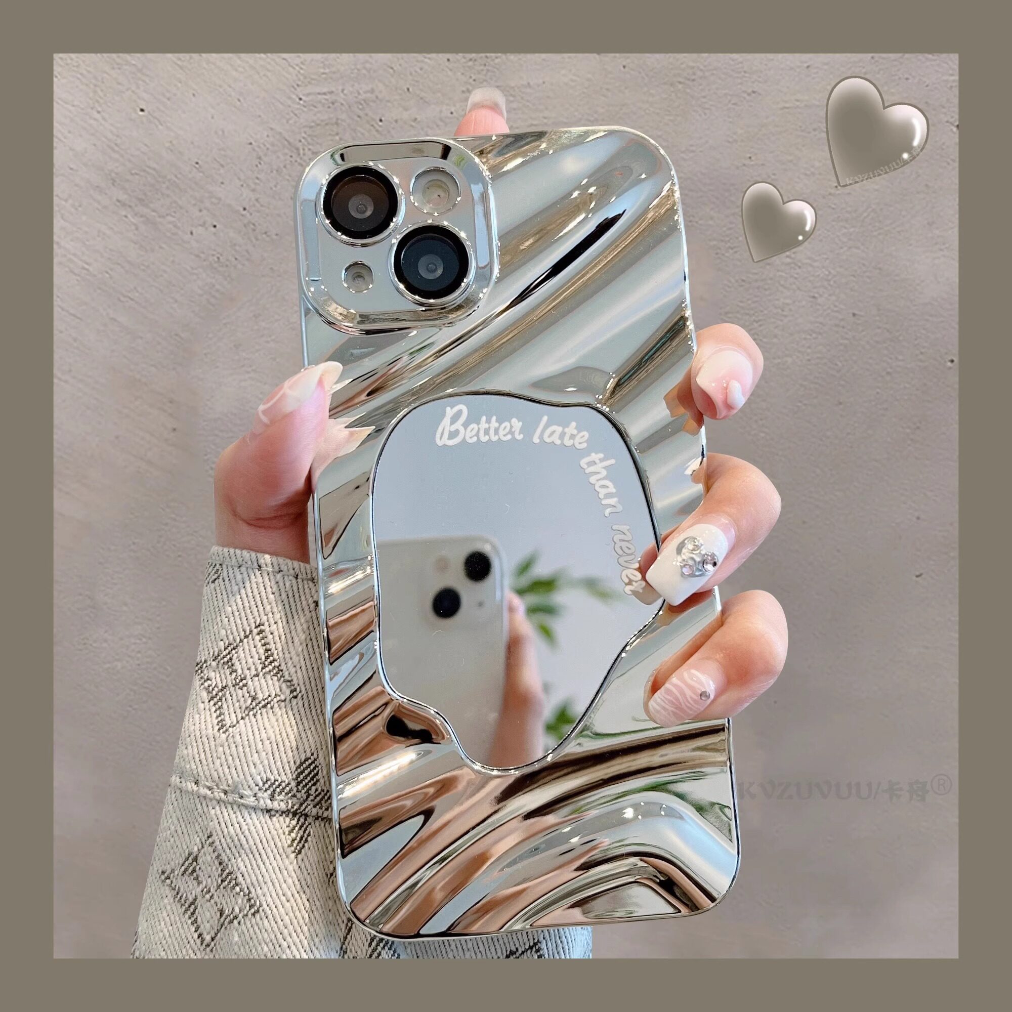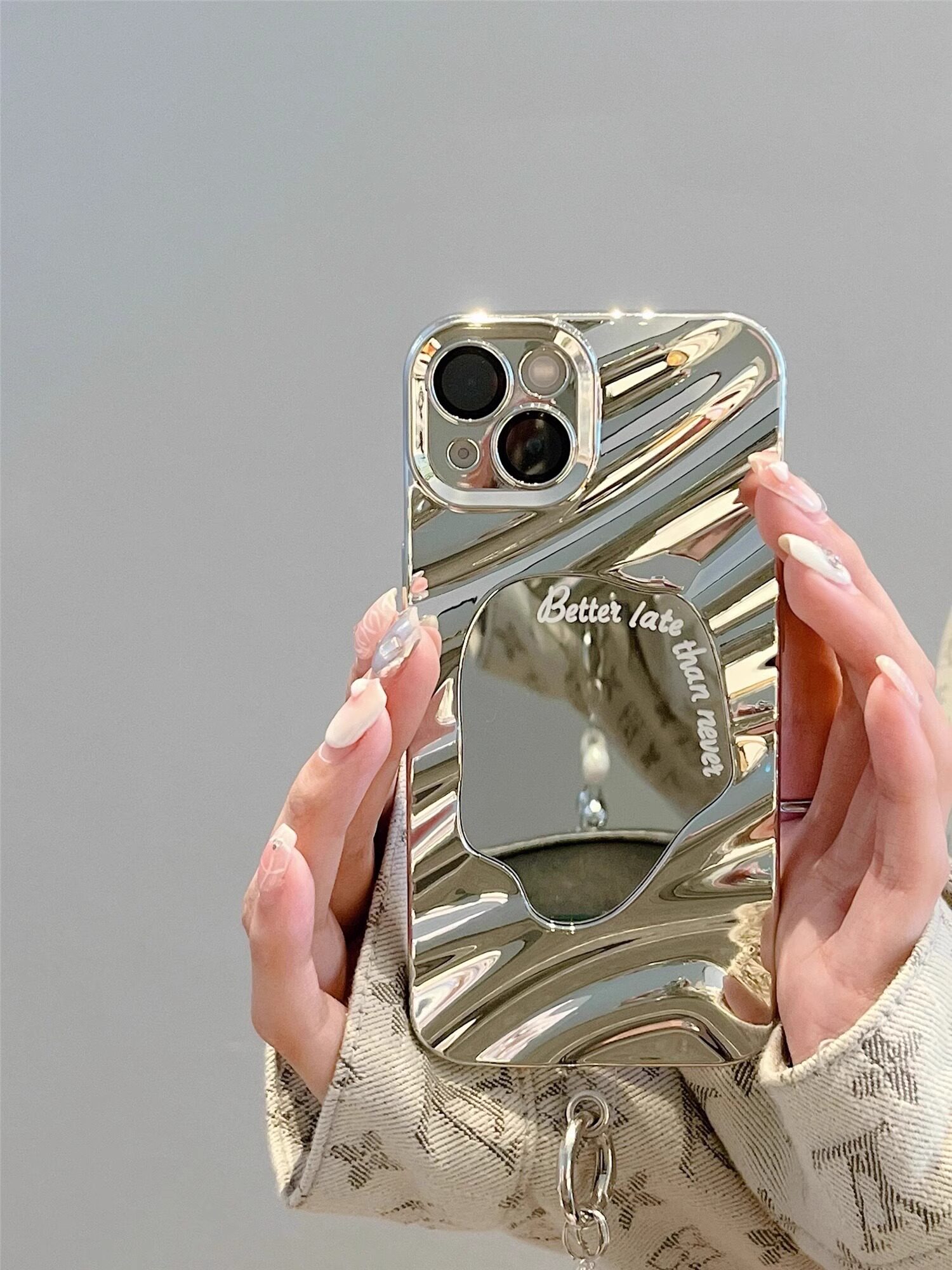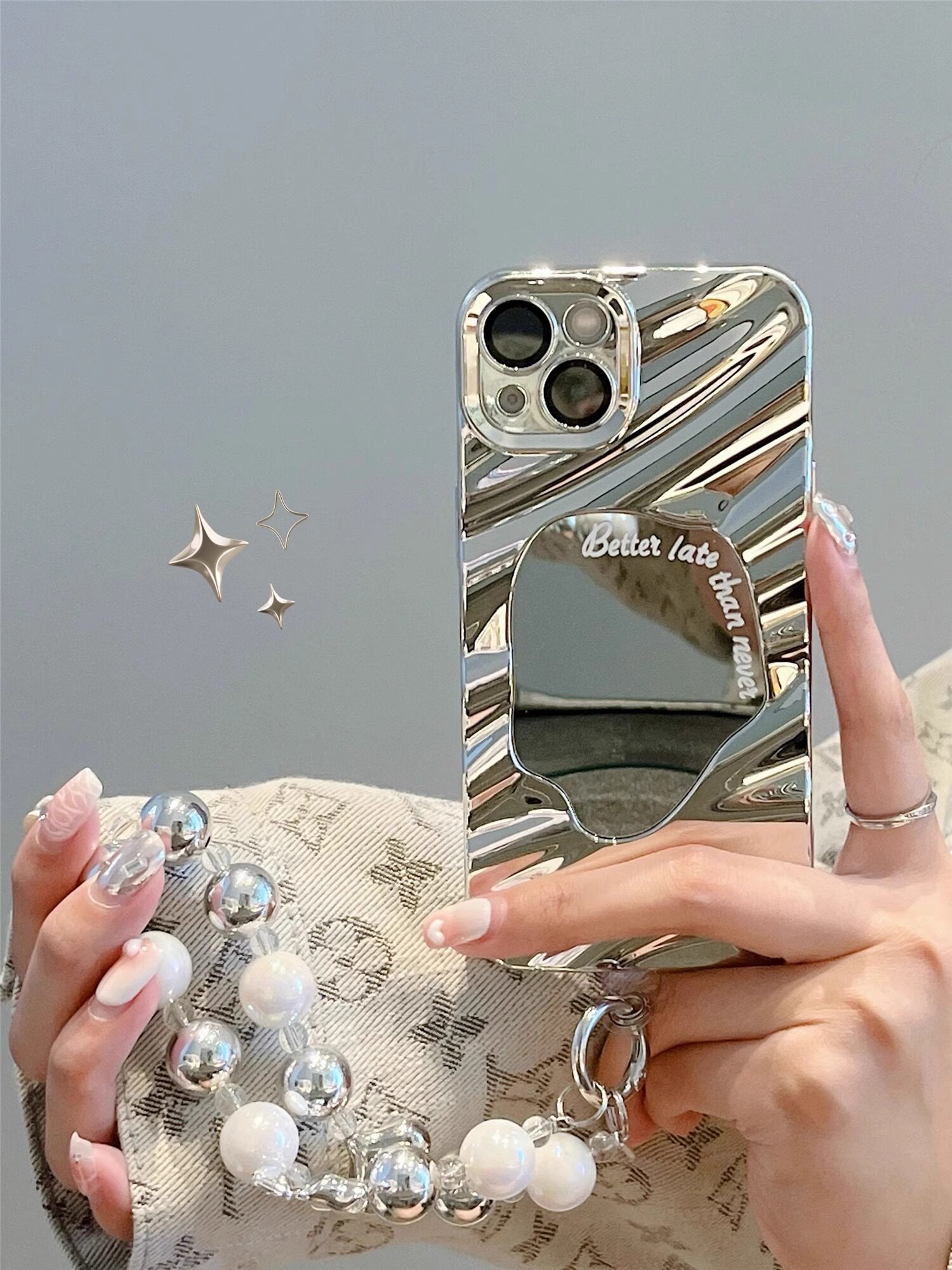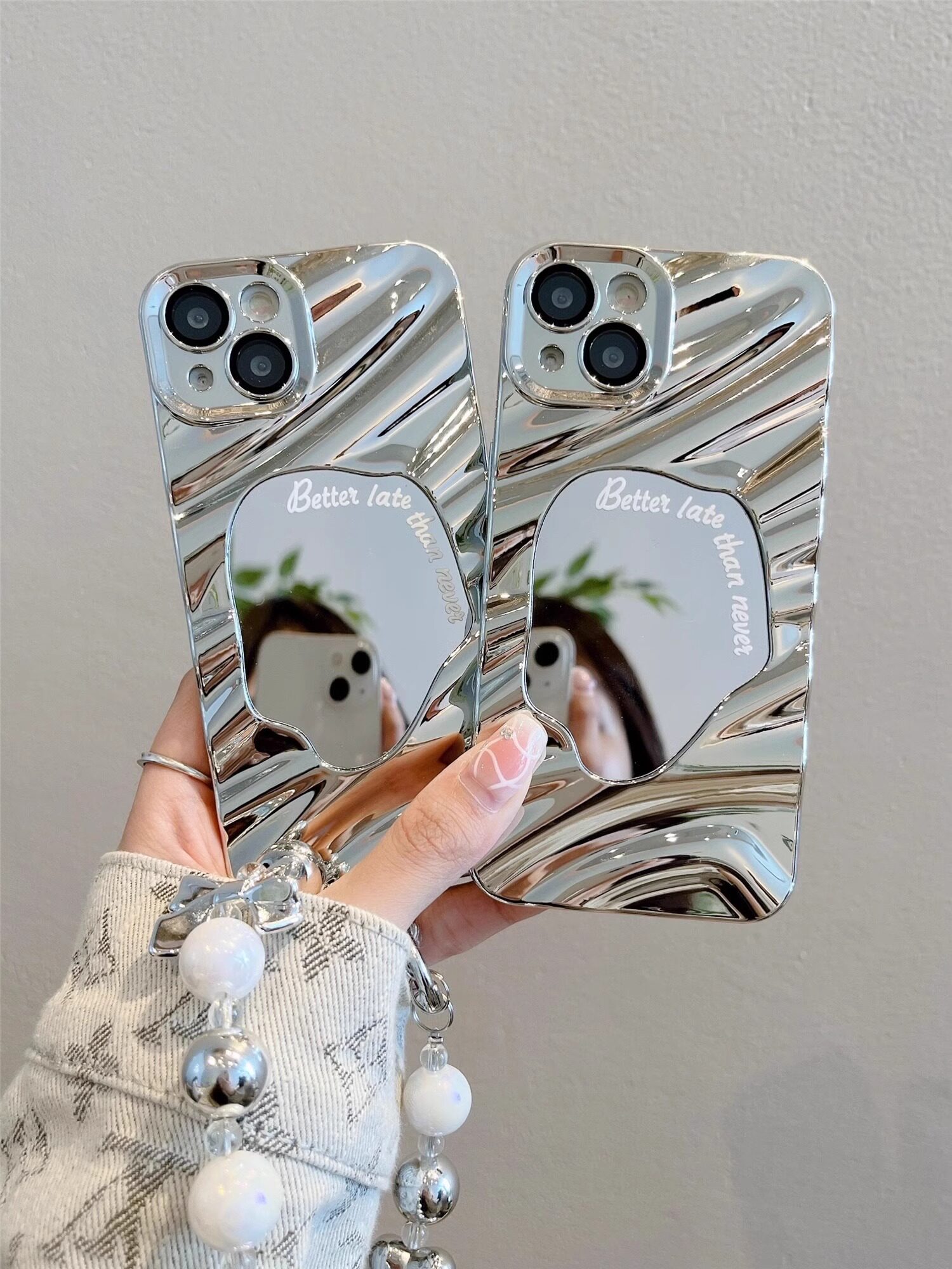 高级感水波纹电镀银镜面手链适用苹果17promax手机壳iphone16/15补妆镜14新款13pro全包防摔12腕带8plus软7女