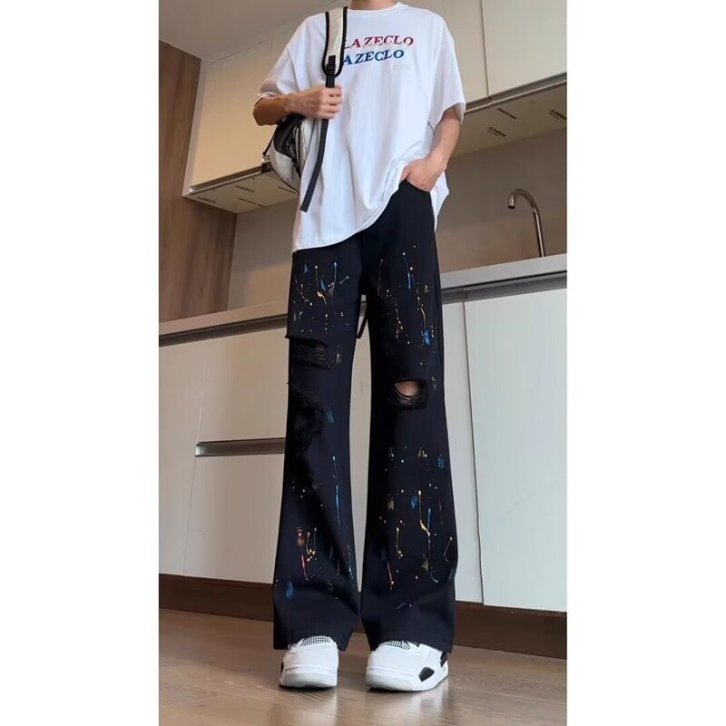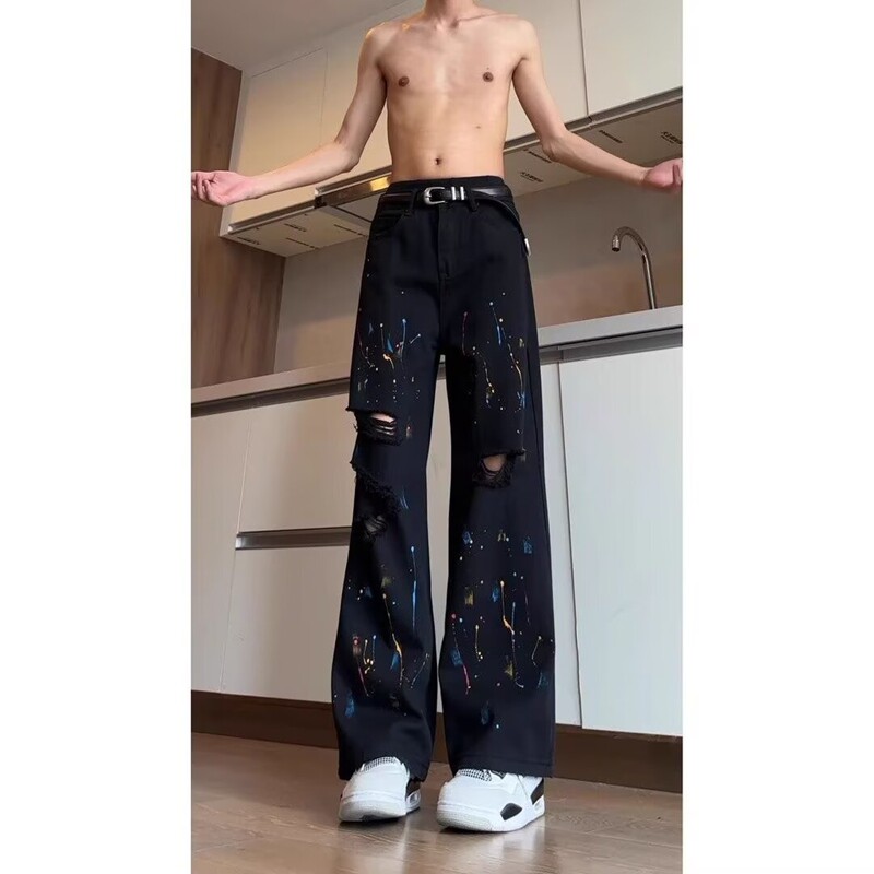 美式破洞牛仔裤男款2026新款春季宽松阔腿裤子高街潮流泼墨直筒裤