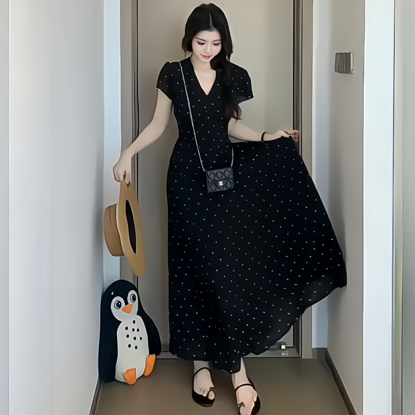 巨好看韩系温柔风V领波点连衣裙女夏2026年新款掐腰显瘦气质长裙