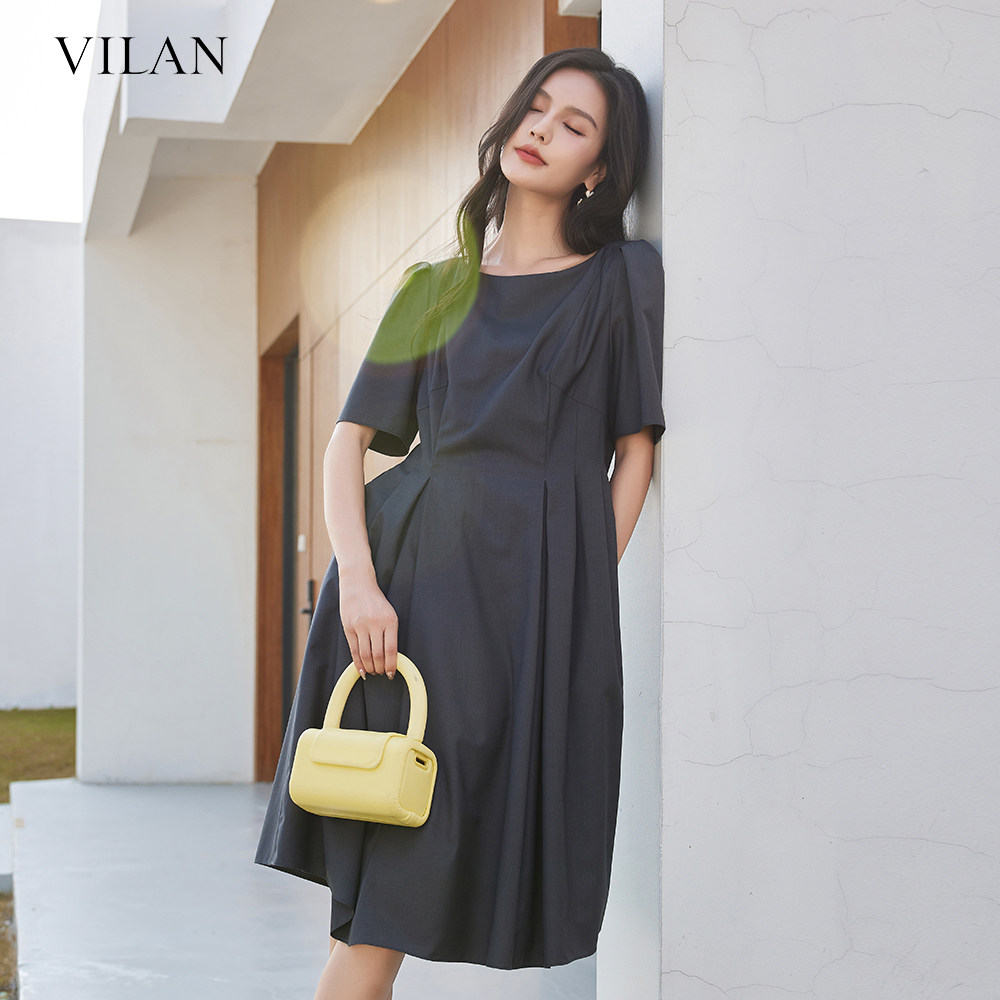 vilan/慧兰法式连衣裙女小个子2025秋季新款修身显瘦短袖中长裙子