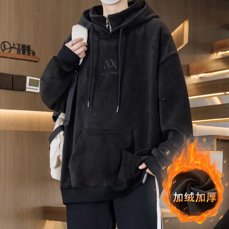 冬季新款双面绒圆领男生卫衣帅气防风领口加绒加厚长袖T恤青少年