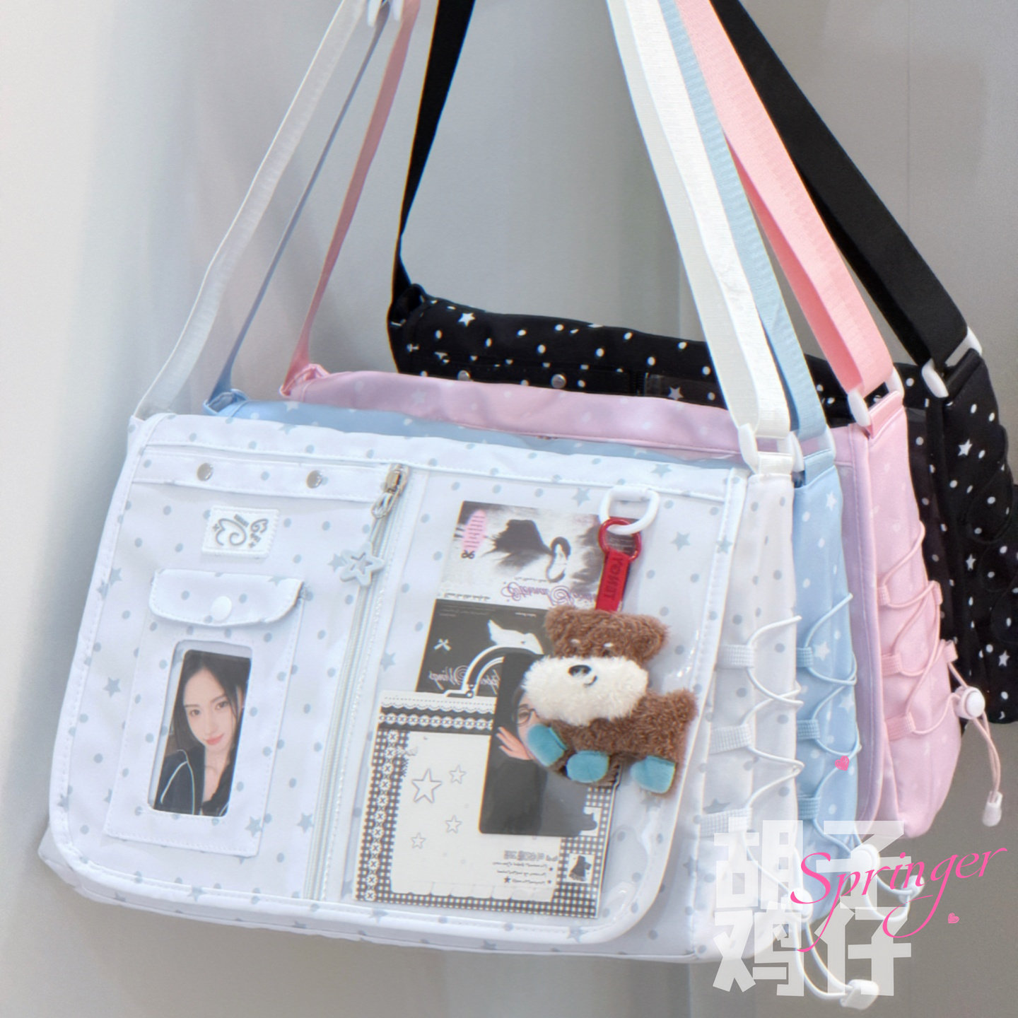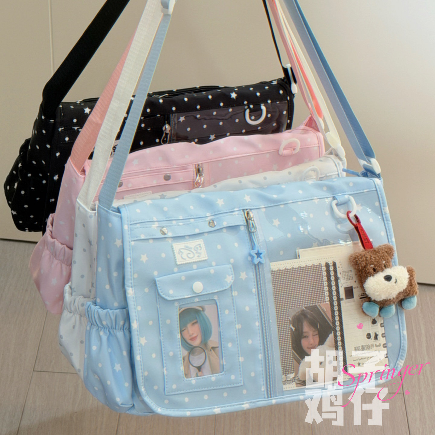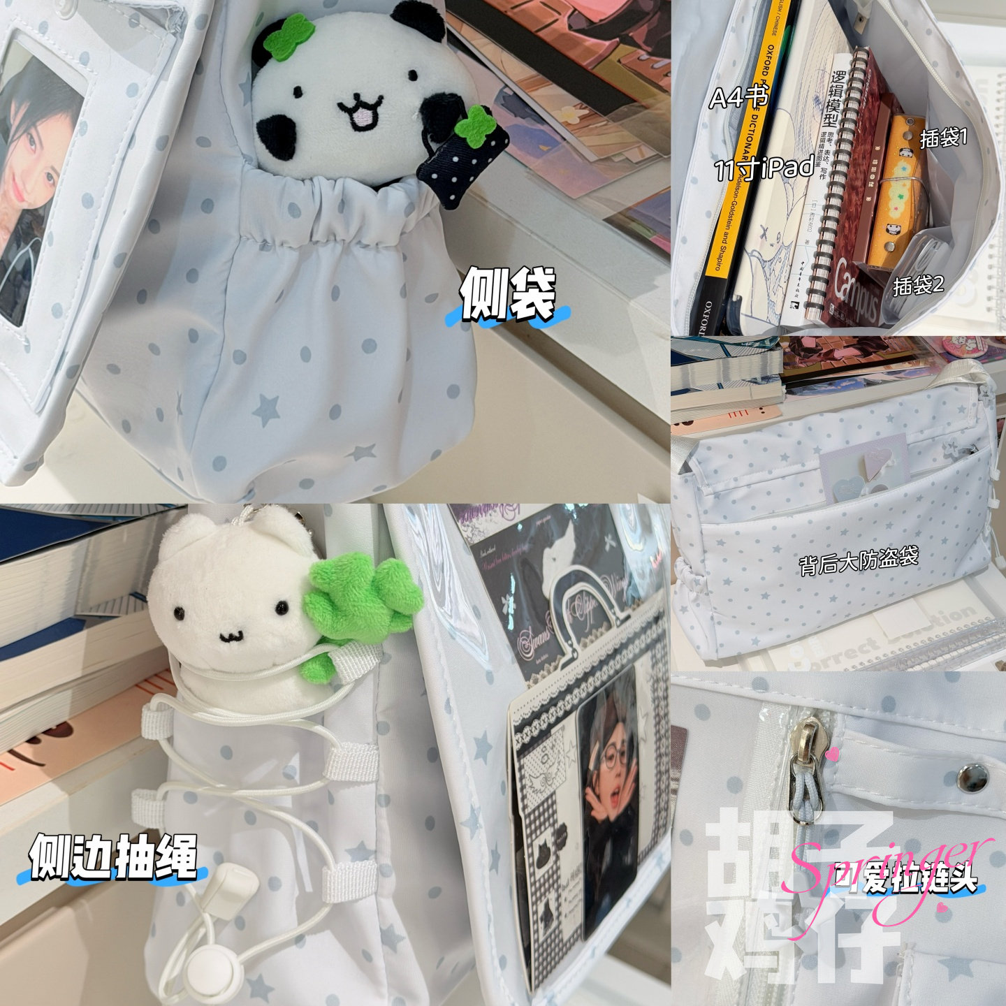 胡子鸡仔韩系甜美可爱风波点斜挎包痛包大容量娃包抽绳通勤背包女