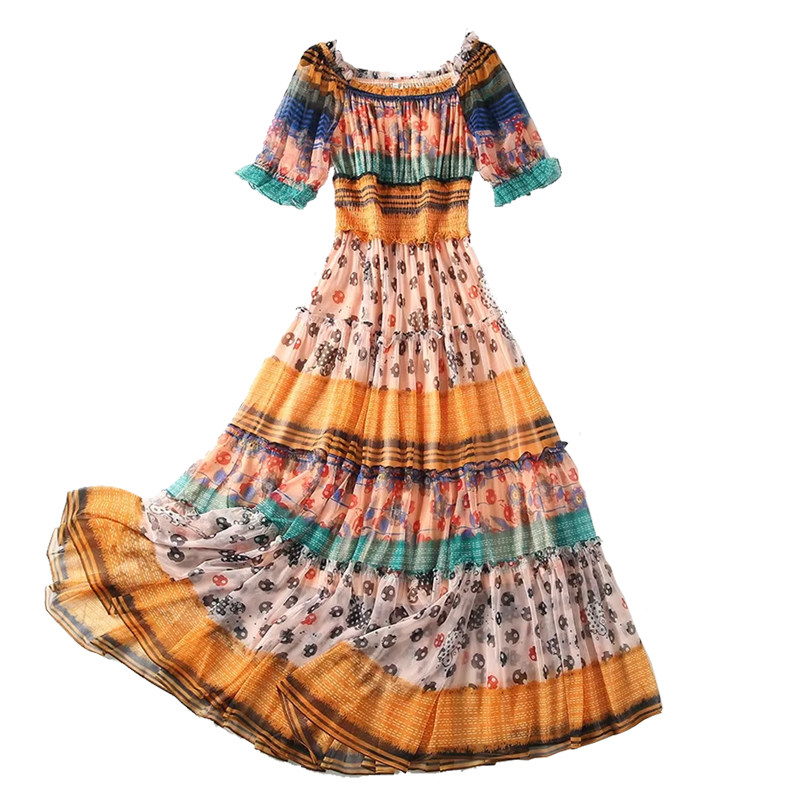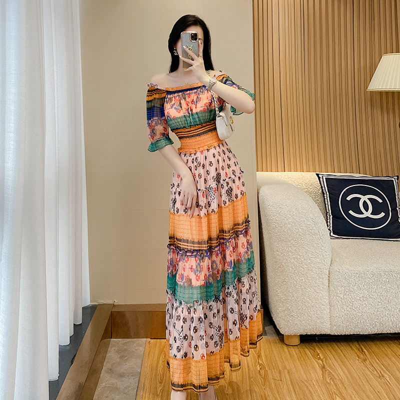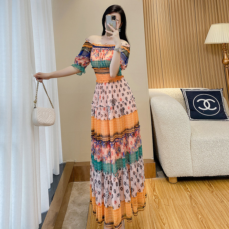 高级感度假连衣裙女夏季新款一字肩雪纺印花三亚海边沙滩长裙裙子