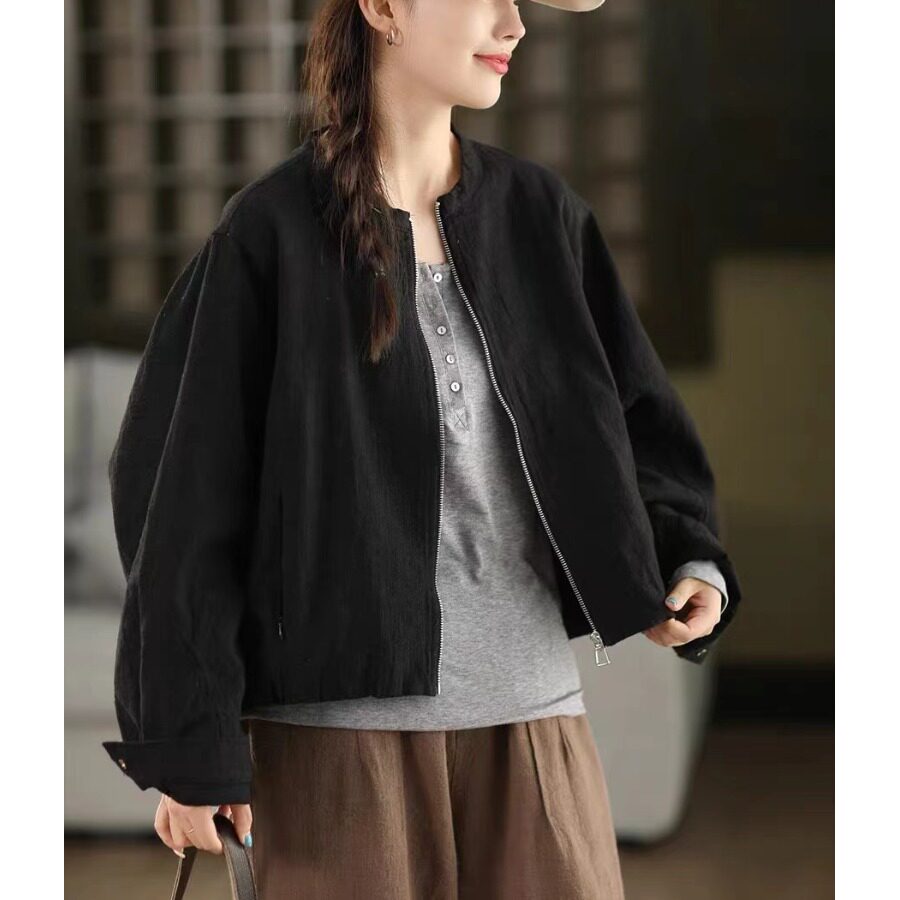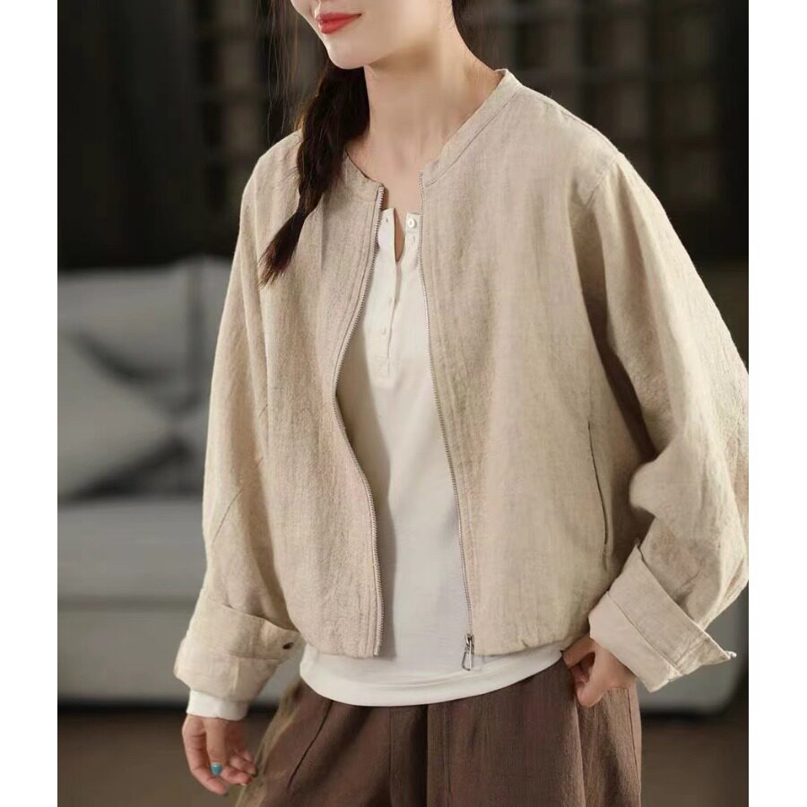 日系棉麻短外套女款2025新款春秋小个子拉链开衫外搭上衣宽松夹克