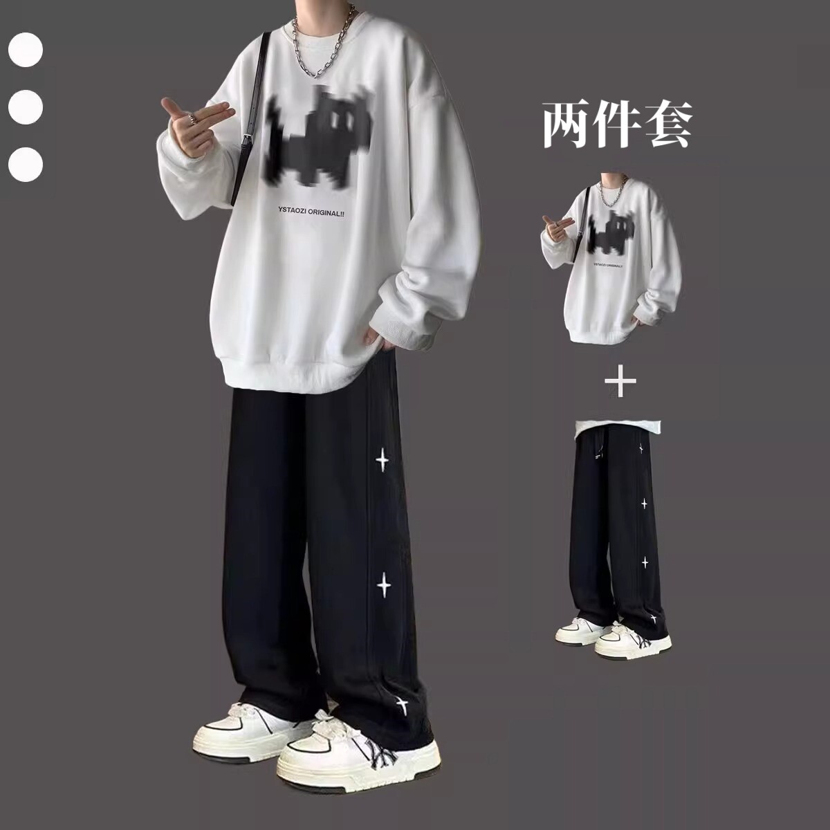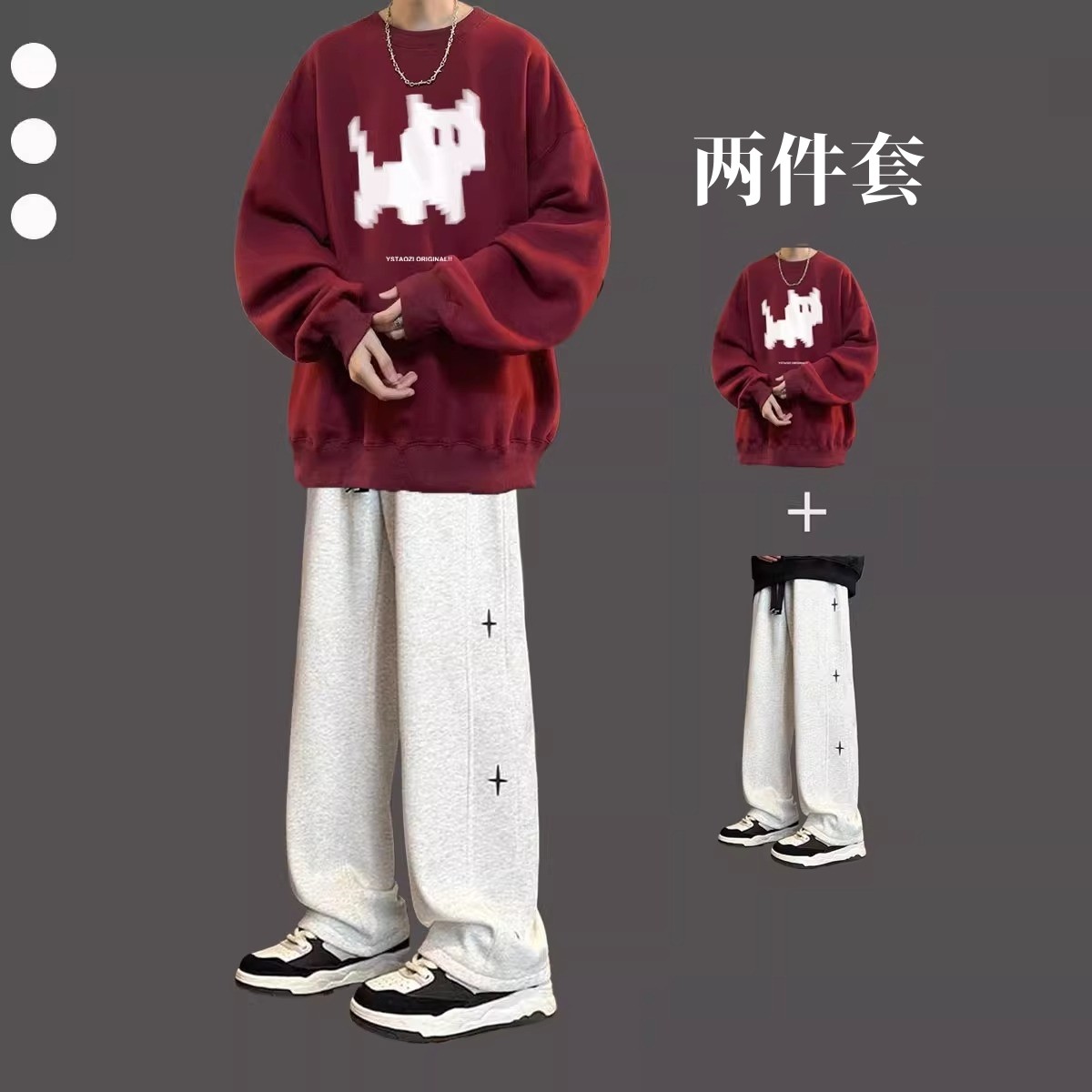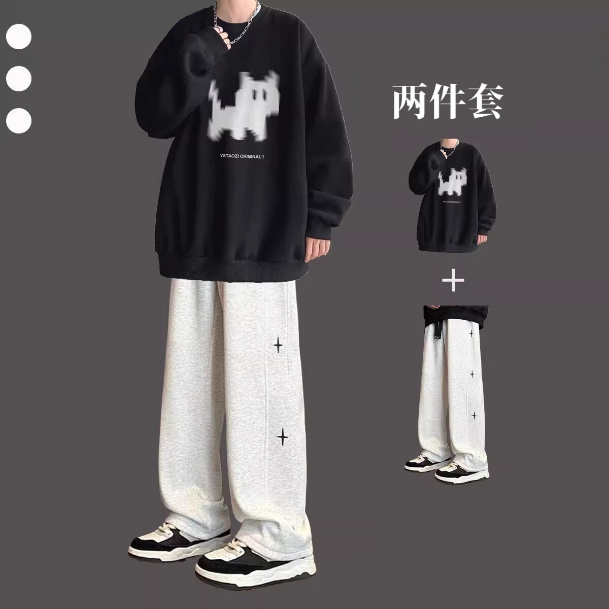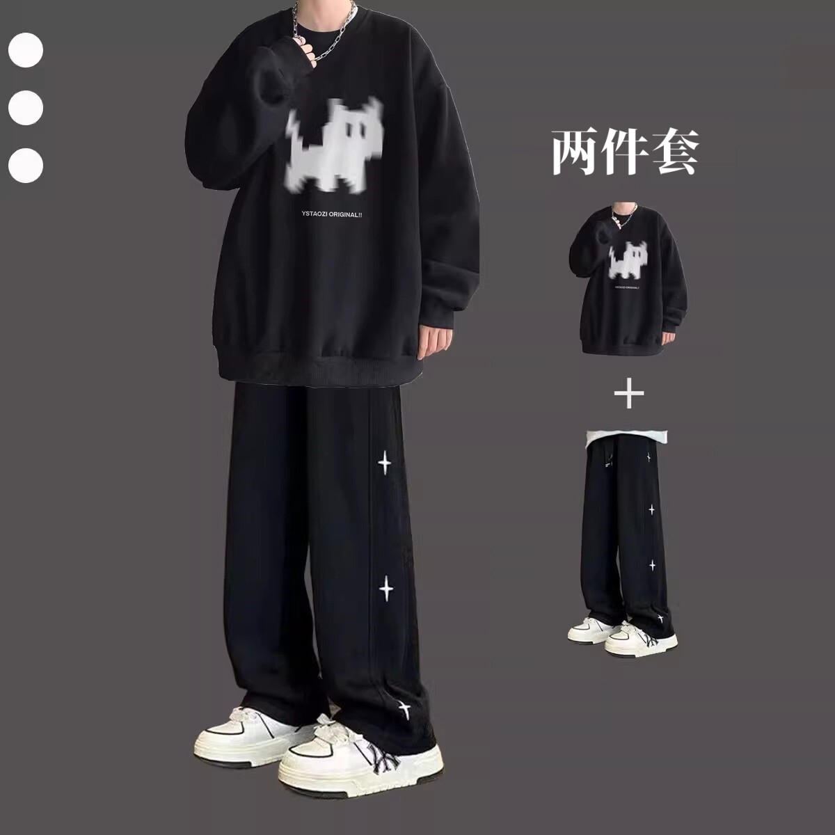 男生秋冬加绒潮牌穿搭卫衣套装青少年男装帅气学生潮流休闲运动装