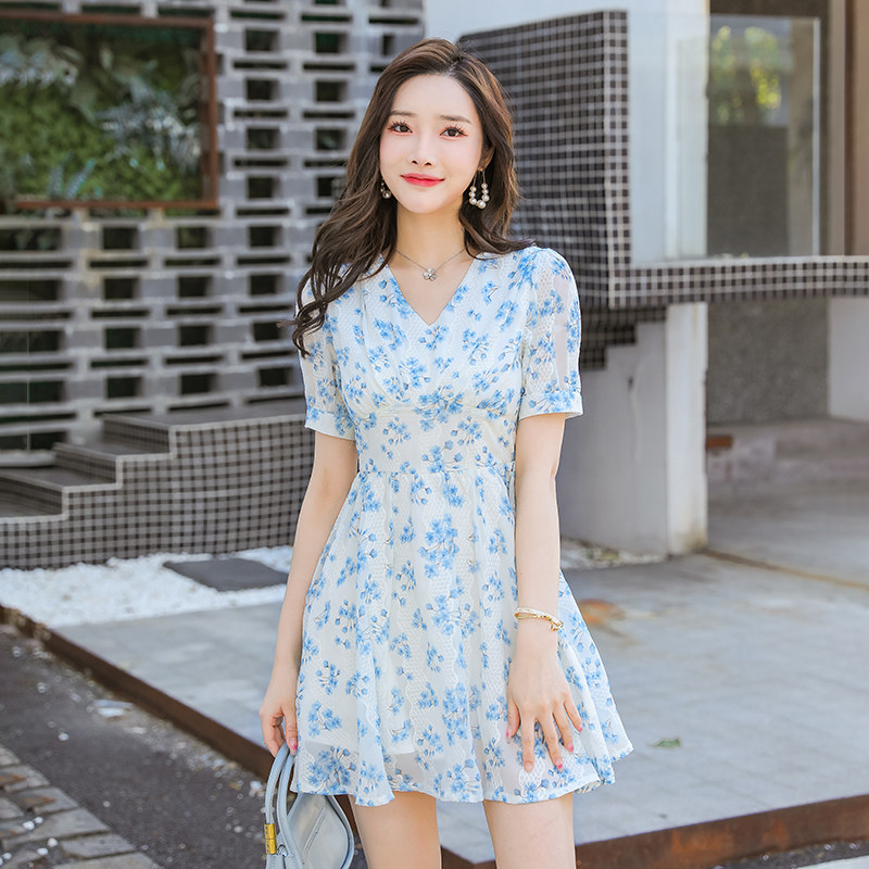 蓝色碎花雪纺小个子连衣裙2025新款女夏季显高气质高雅高级感裙子