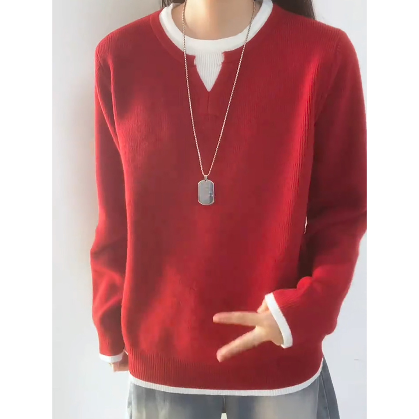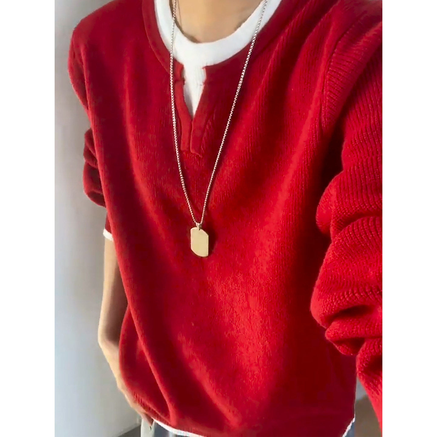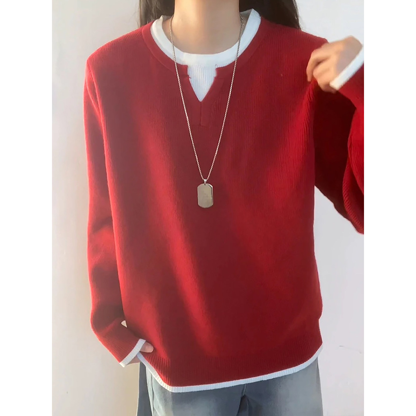 韩版慵懒风撞色假两件毛衣男款秋冬宽松百搭针织衫本命年红色外套