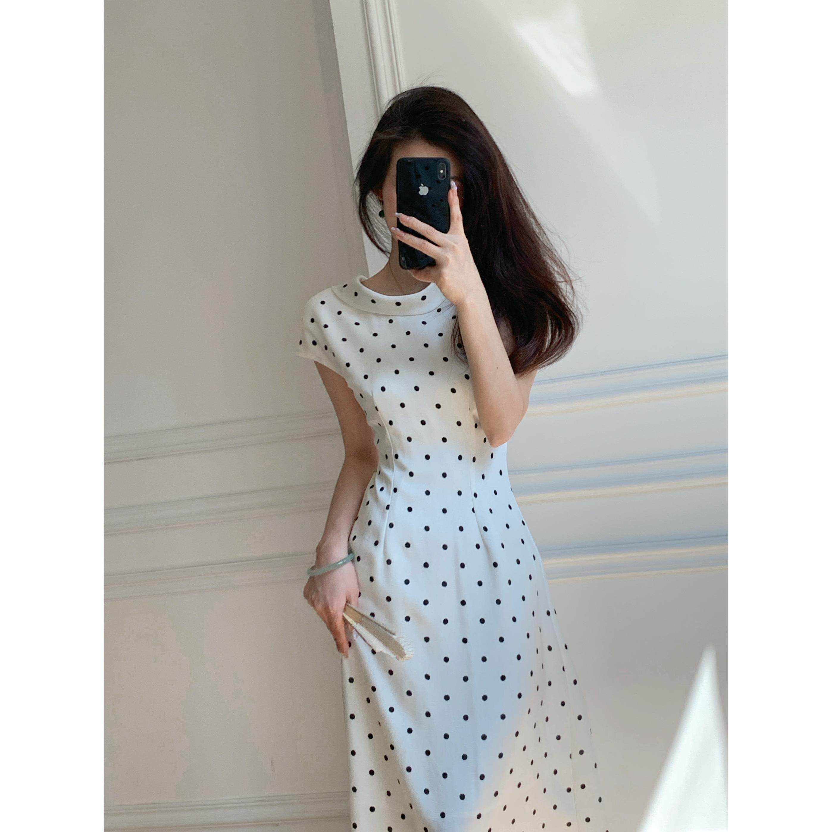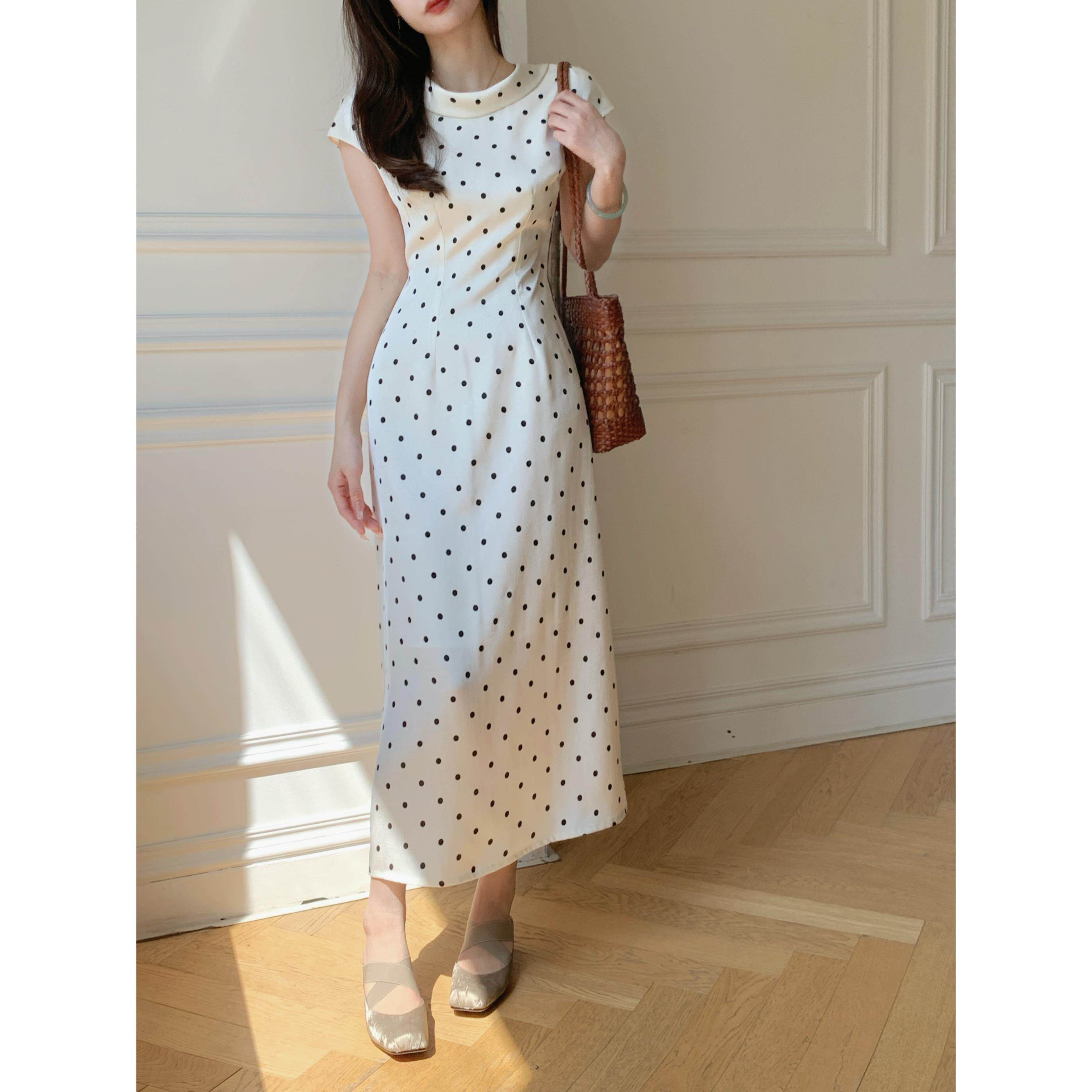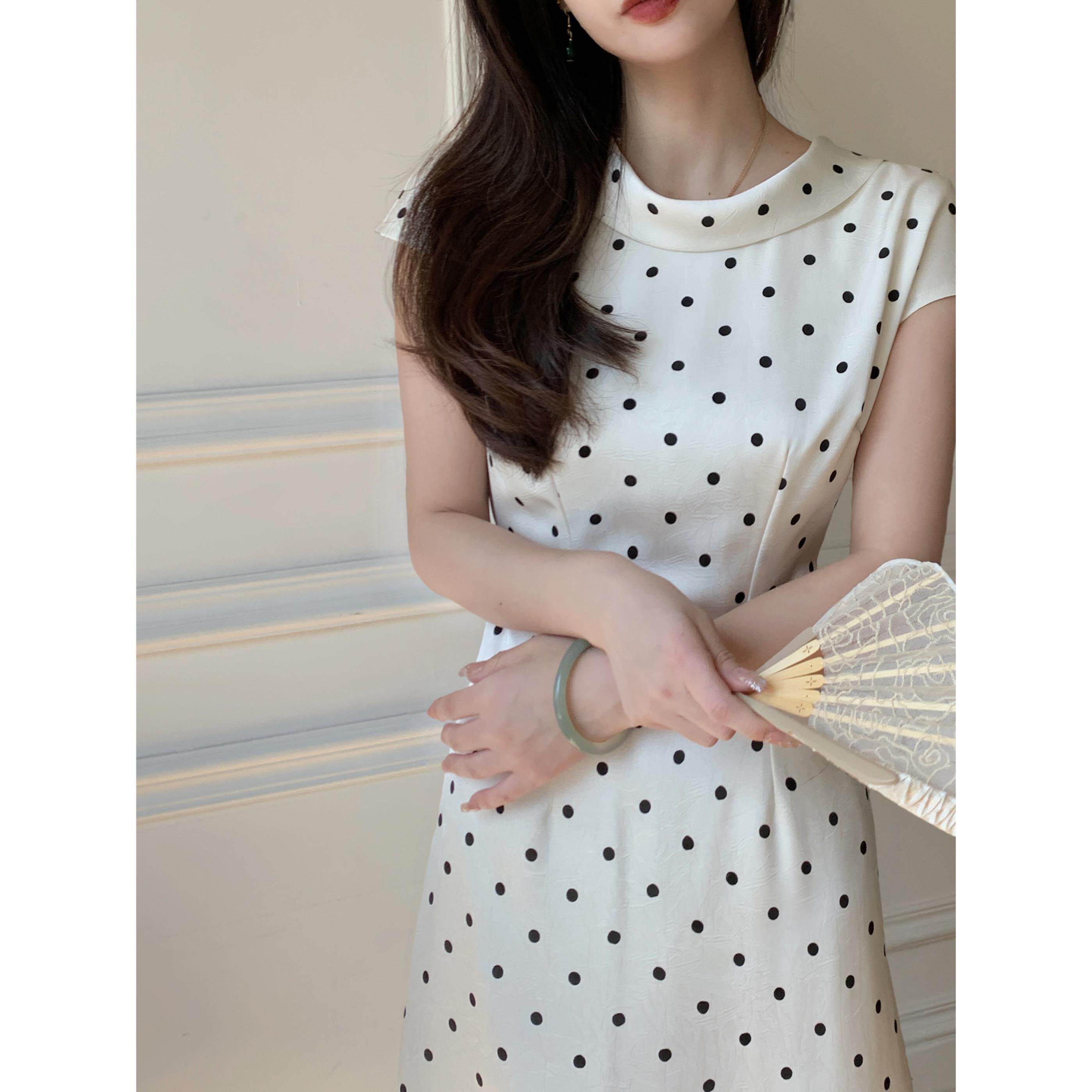 白色高级感长裙夏新款法式波点大圆领气质缎面收腰显瘦连衣裙