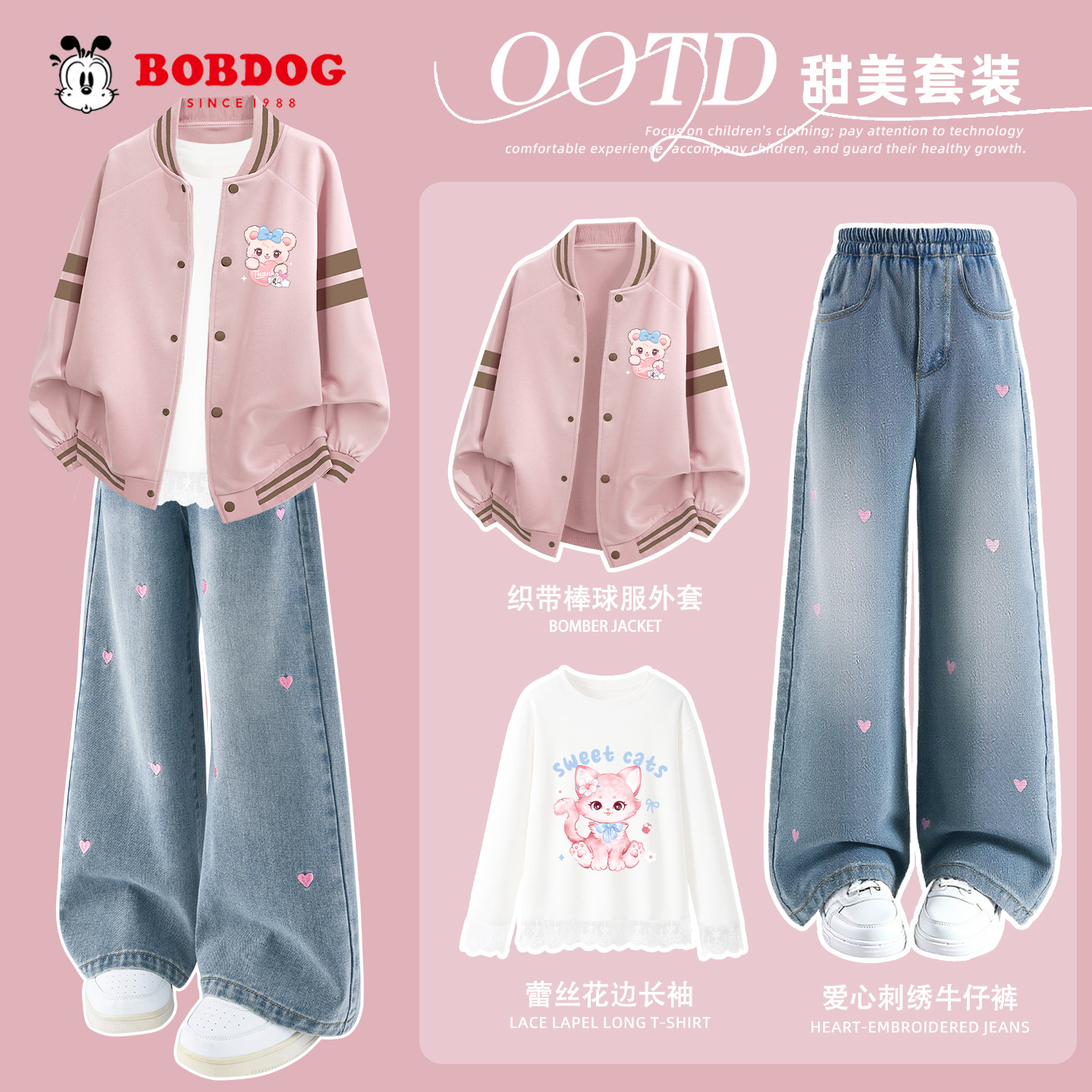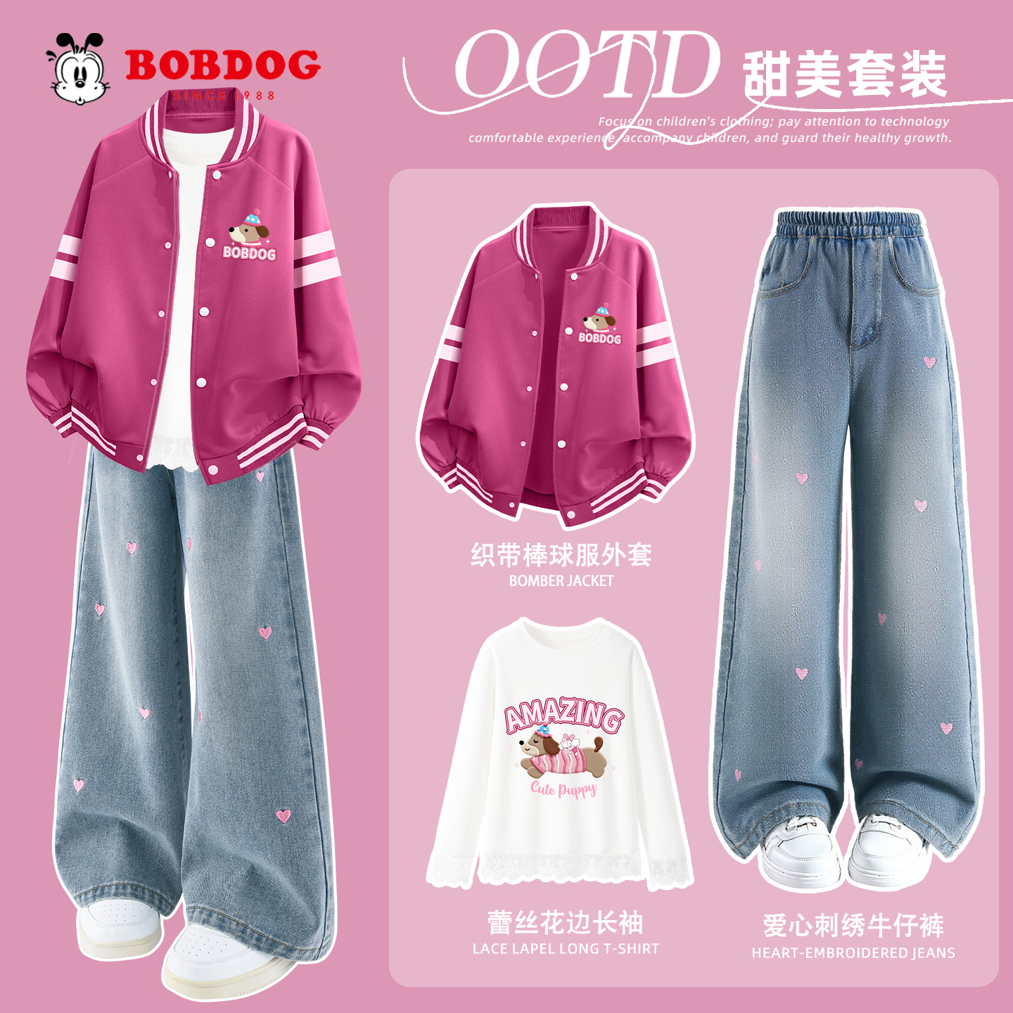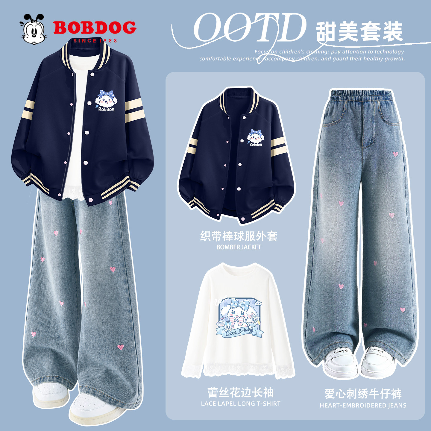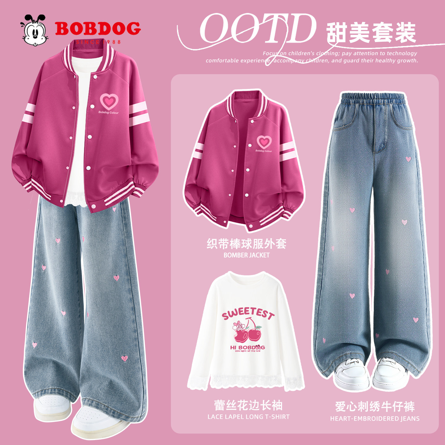 巴布豆女童套装春装2026新款洋气时髦女大童棒球服外套儿童三件套