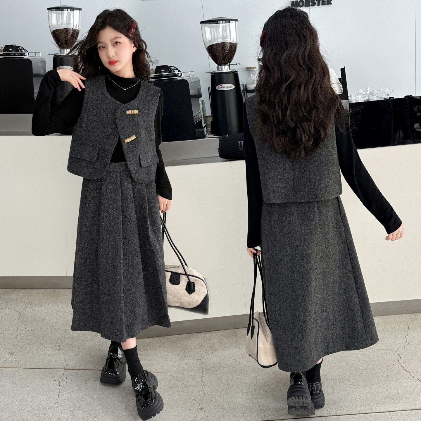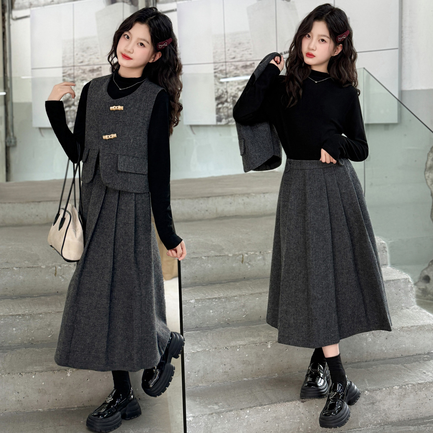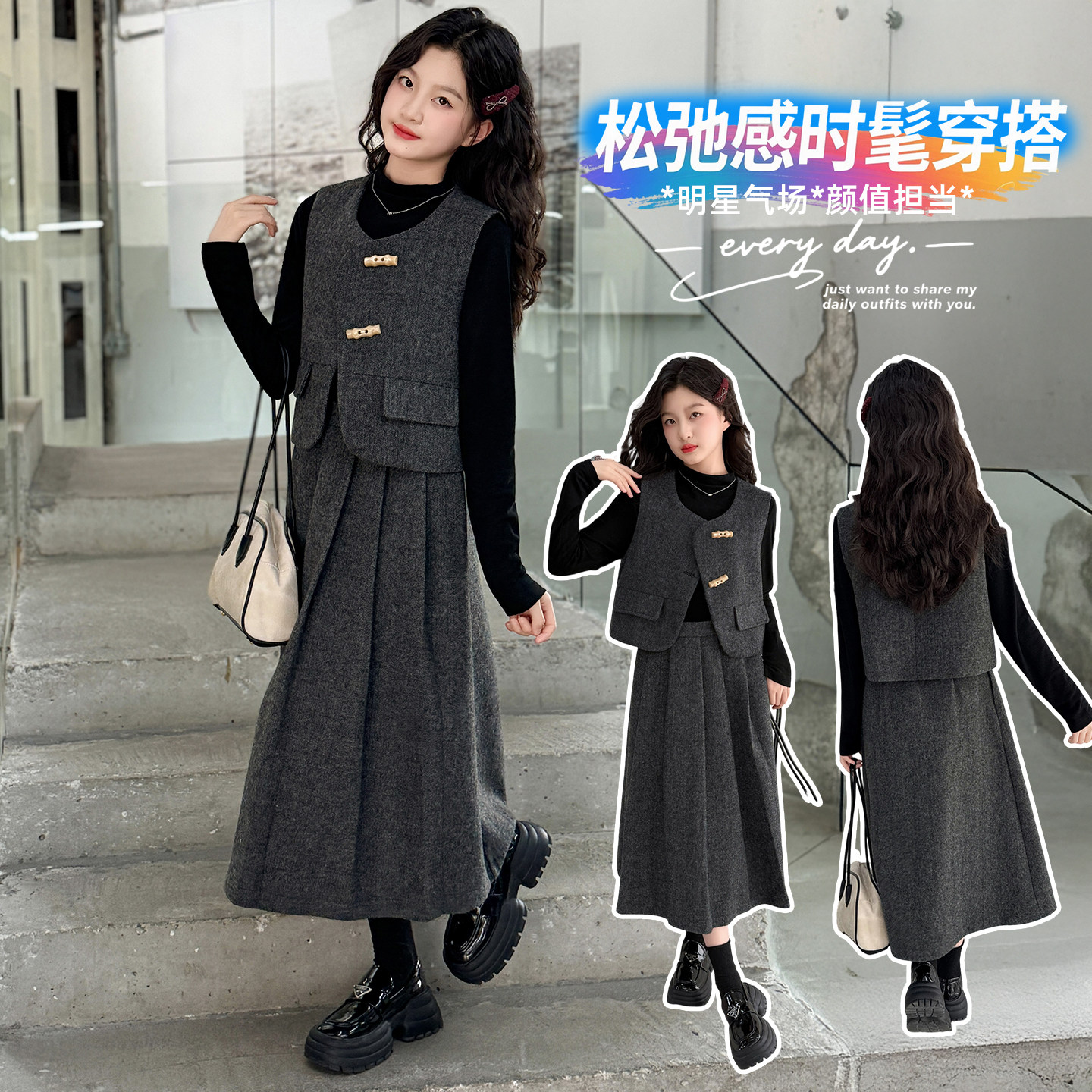 女童小香风连衣裙秋冬款时尚2026新款中大童女孩马甲三件套高级感