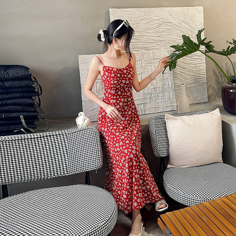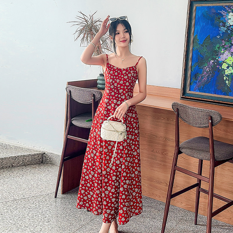 红色碎花吊带连衣裙2025新款今年流行爆款显瘦长裙大码女装胖mm夏