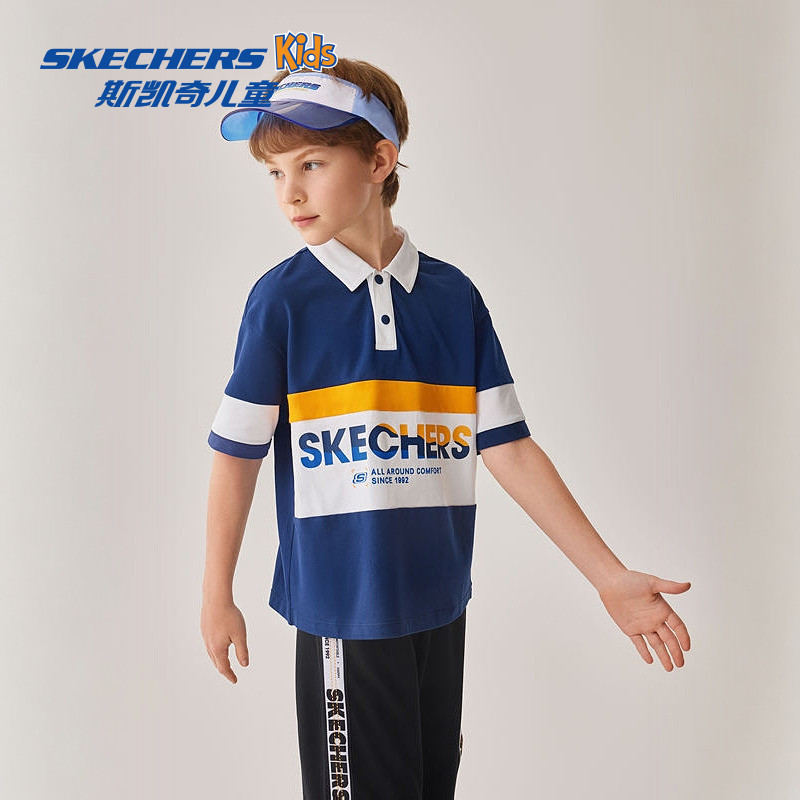 Skechers斯凯奇童装男童梭织衬衫儿童T恤休闲蓝色透气翻领短袖衫