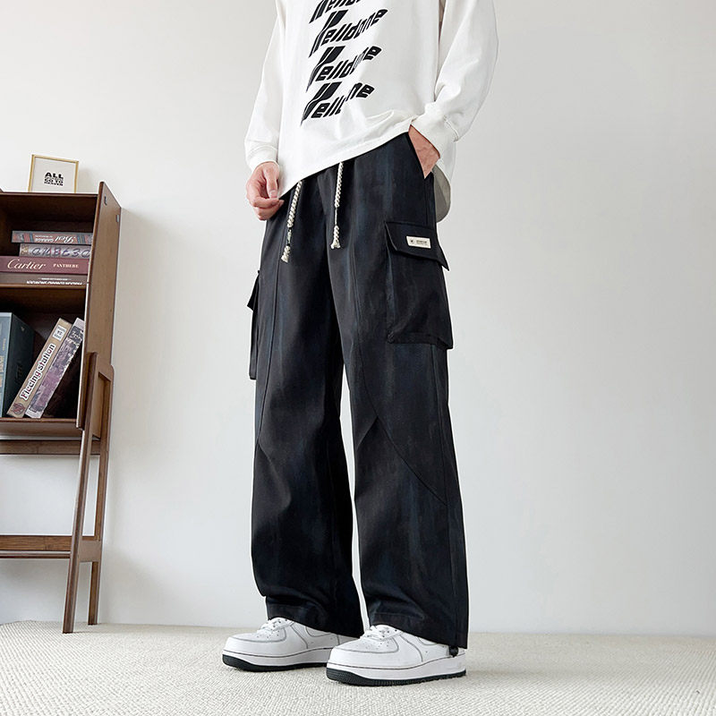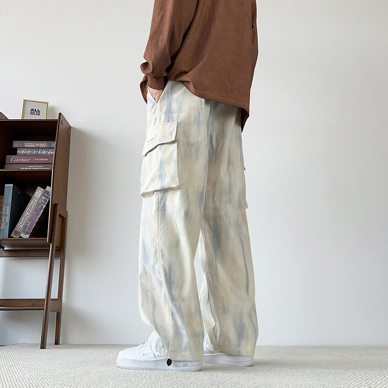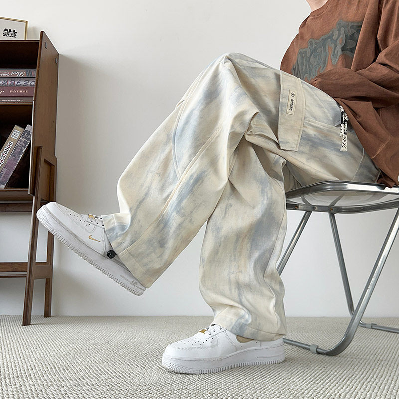 美式扎染工装裤男秋冬季加绒直筒宽松休闲裤子潮牌青少年大码长裤