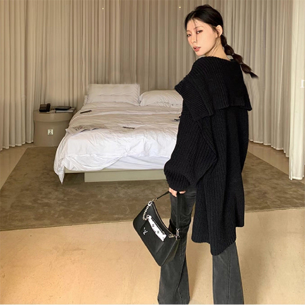 黑色翻领中长款毛衣外套女春秋冬季加厚慵懒风宽松针织开衫高级感