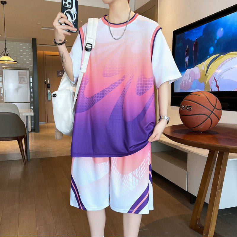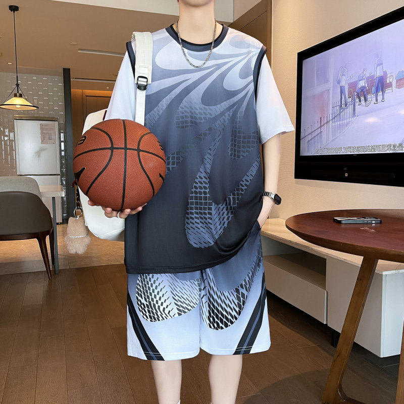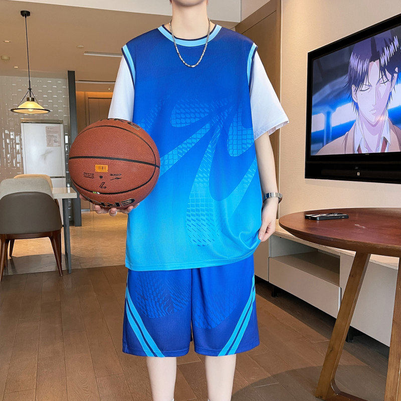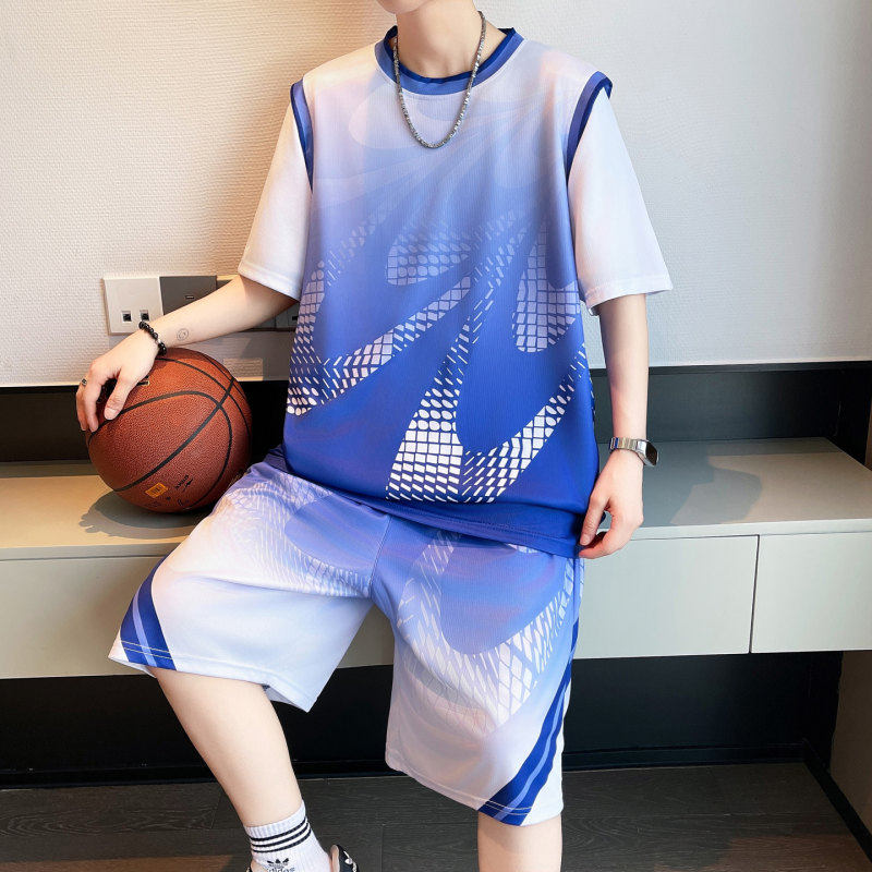 短袖篮球服套装男球衣定制速干冰丝T恤青少年运动宽松短裤假两件