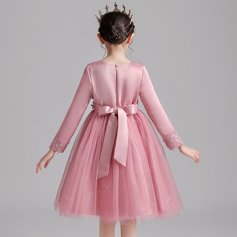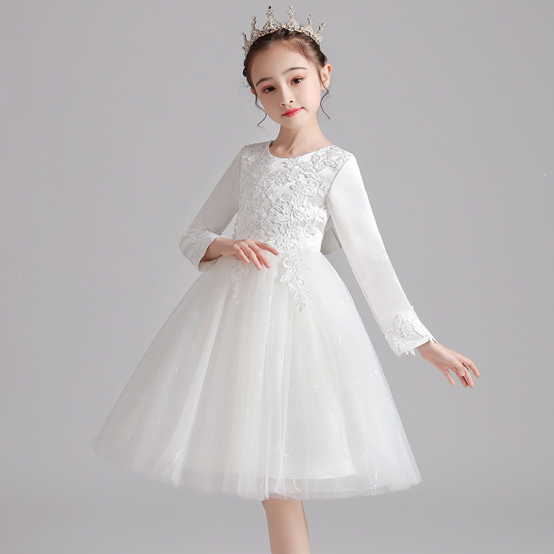 女童白色婚纱连衣裙花童公主裙蓬蓬纱裙子春秋冬长袖儿童演出礼服