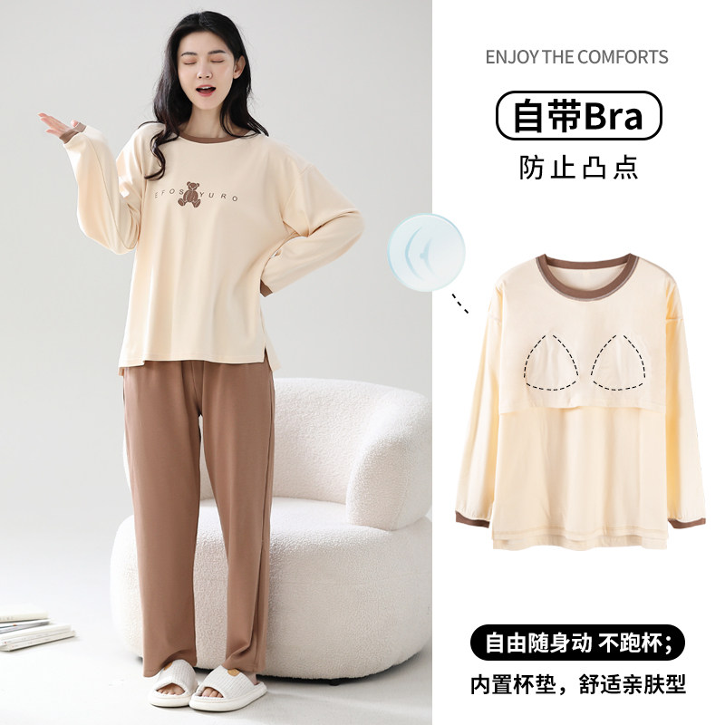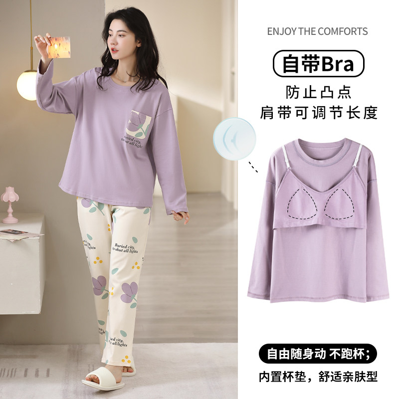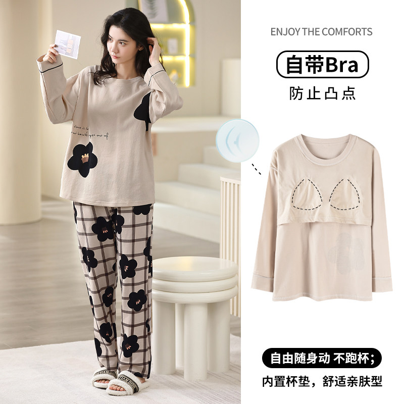 带胸垫睡衣女春秋纯棉长袖可外穿家居服套装防凸点加厚圆领长裤