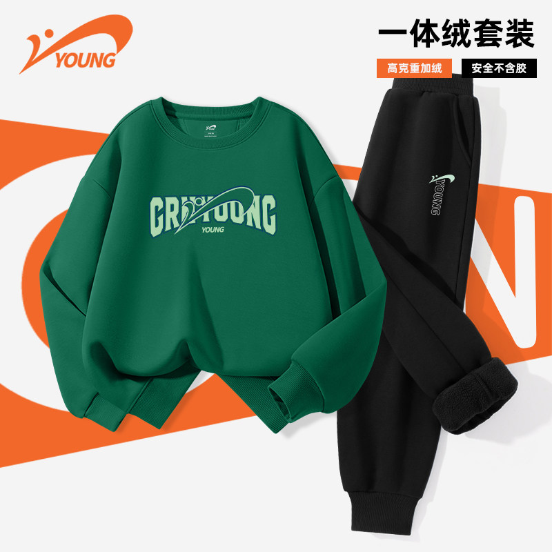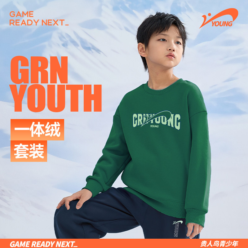 贵人鸟童装男童冬装套装儿童加绒运动服大童黑色卫衣青少年两件套
