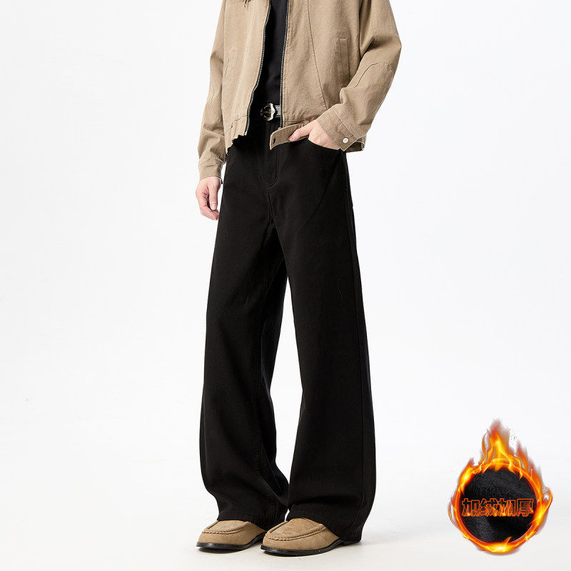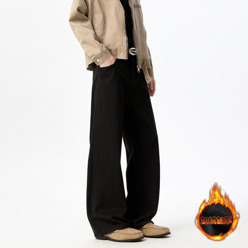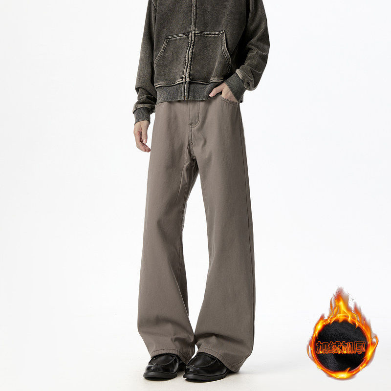 冬季纯棉加绒休闲裤男弯刀裤直筒宽松潮牌青少年加厚直筒裤子男